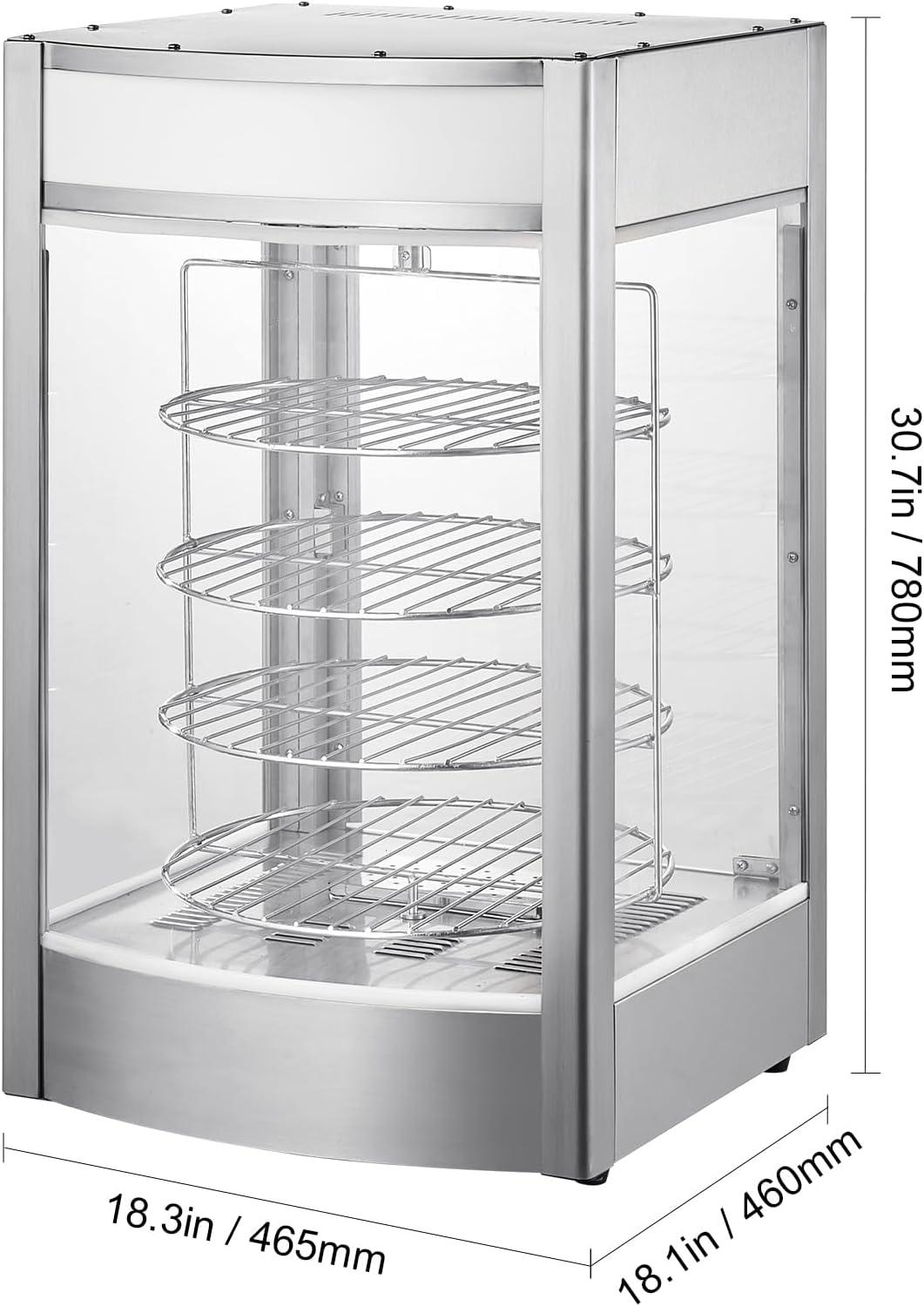 Spacious 4-Tier Design: With dimensions of 18;3 x 18;1 x 30;7 inches (465 x 460 x 780 mm), this display cabinet offers 4 generous shelves for food storage; It comfortably holds up to four 14-inch pizzas, making it perfect for restaurants, pizza shops, and cafes;
