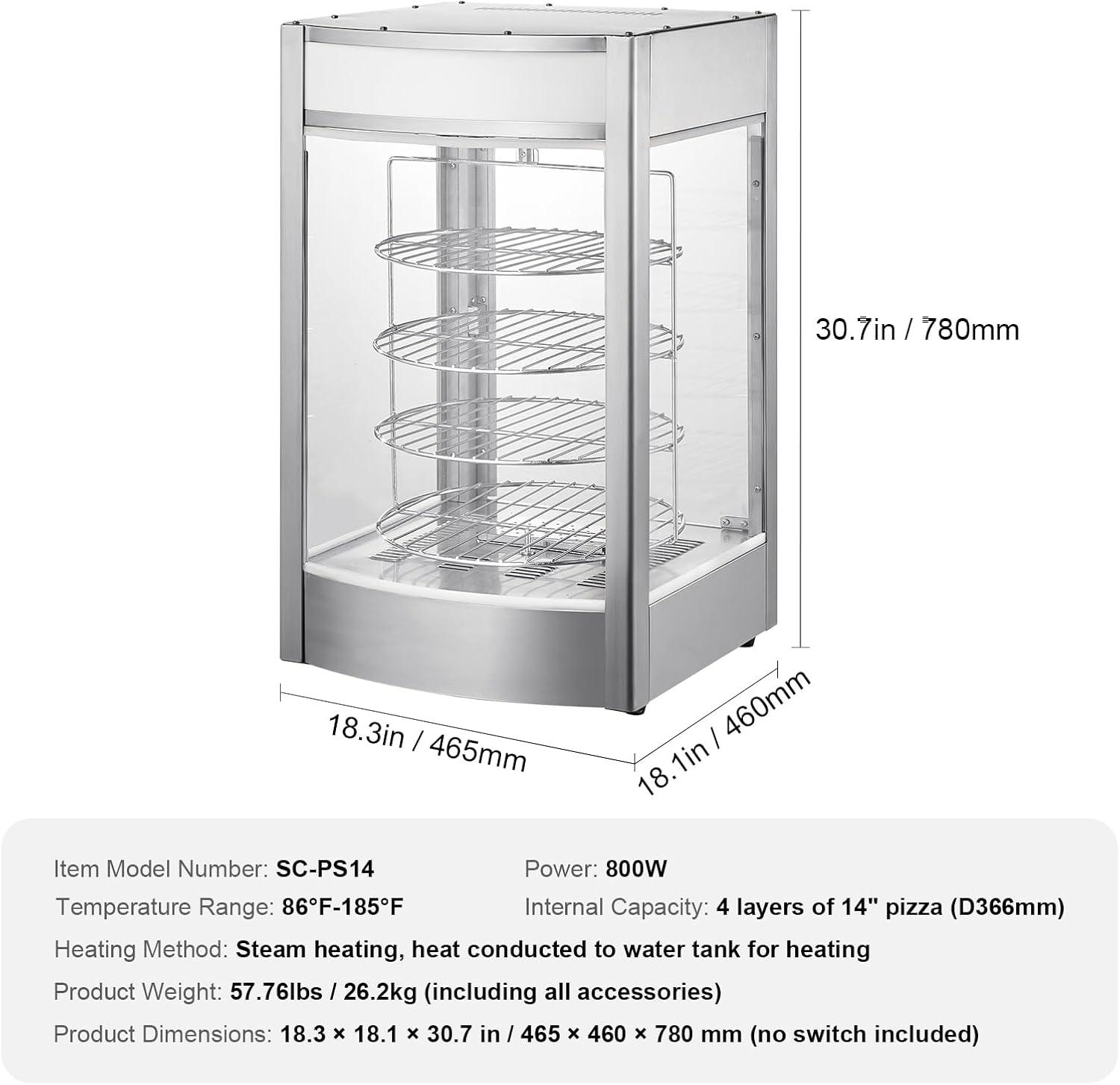 Product Dimensions: 465 x 460 x 780 mm (18.3 x 18.1 x 30.7 inches), Power: 800W, Temperature Range: 30°C ~ 85°C (86°F ~ 185°F), Internal Capacity: 4-Tier, 14″””” Pizza (D366mm), Product Weight: 26.2 kg (57.8 lbs), Heating Method: Steam heating with heat conducted to the water tank, Note: Switch not included, Item Model Number: SC-PS14.