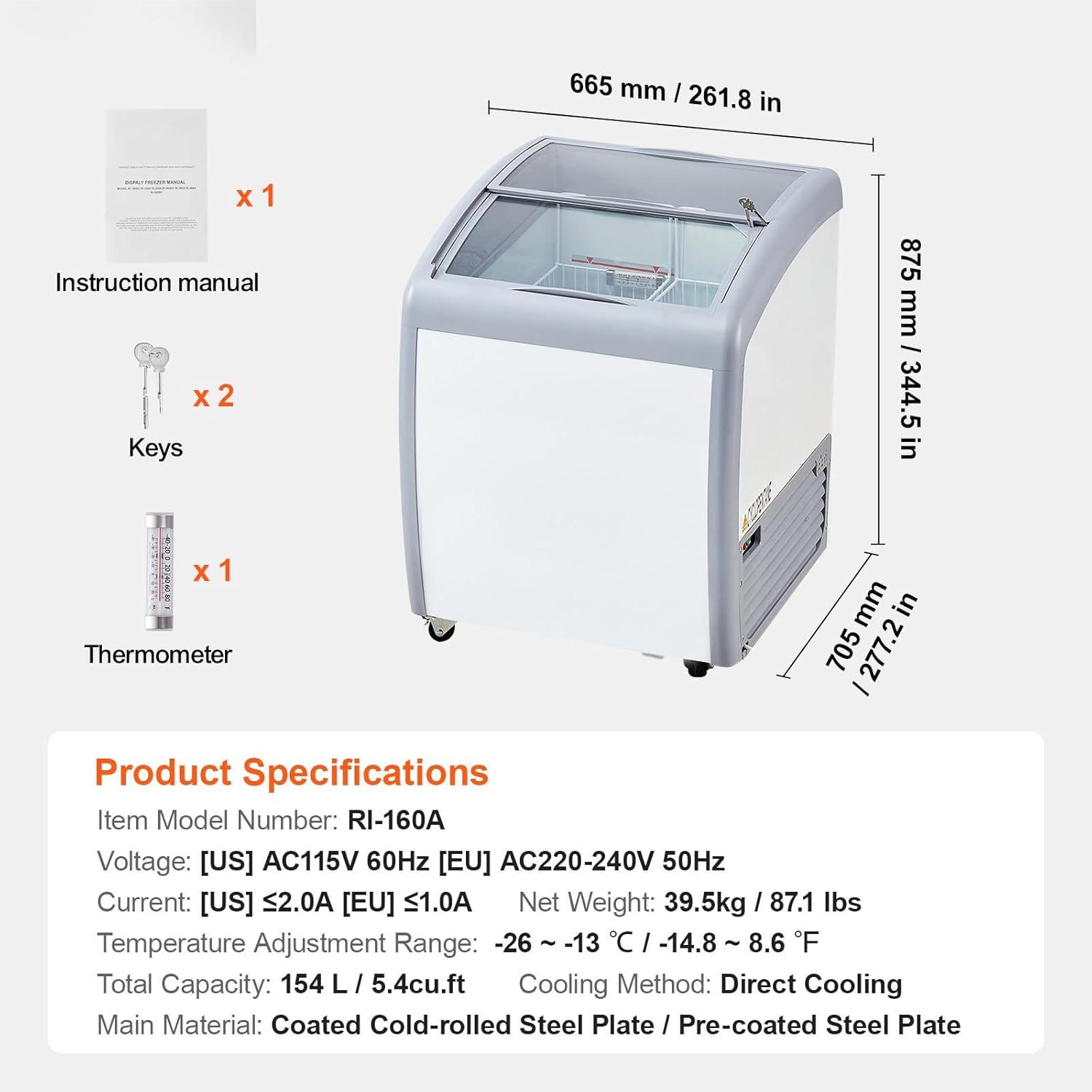 “Capacity: 154 L (5.4 cu.ft) Temperature Adjustment Range: -26°C to -13°C (-14.8°F to 8.6°F) Cooling Method: Direct Cooling Voltage: AC115V 60Hz Net Weight: 39.5 kg (87.1 lbs) Main Material: Coated Cold-rolled Steel Plate / Pre-coated Steel Plate Item Model Number: RI-160A”