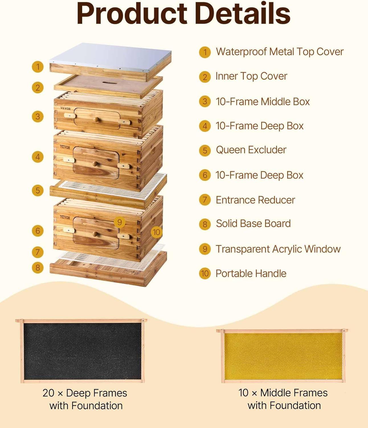 Superior Spacious Design: The interior of 10 frame deep box (19.80″*16.29″*9.64″) is spacious, equipped with 10 ABS lure hive frames and 10 frames of fir wood brood boxes, providing ample space for bee growth and activity. Please note that this product cannot be used alone and needs to be used with a top cover and bottom board.