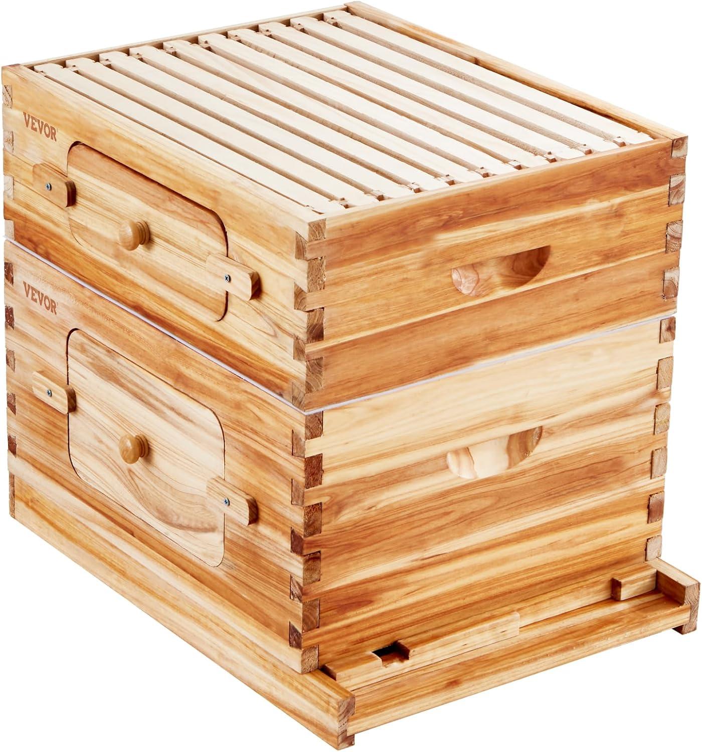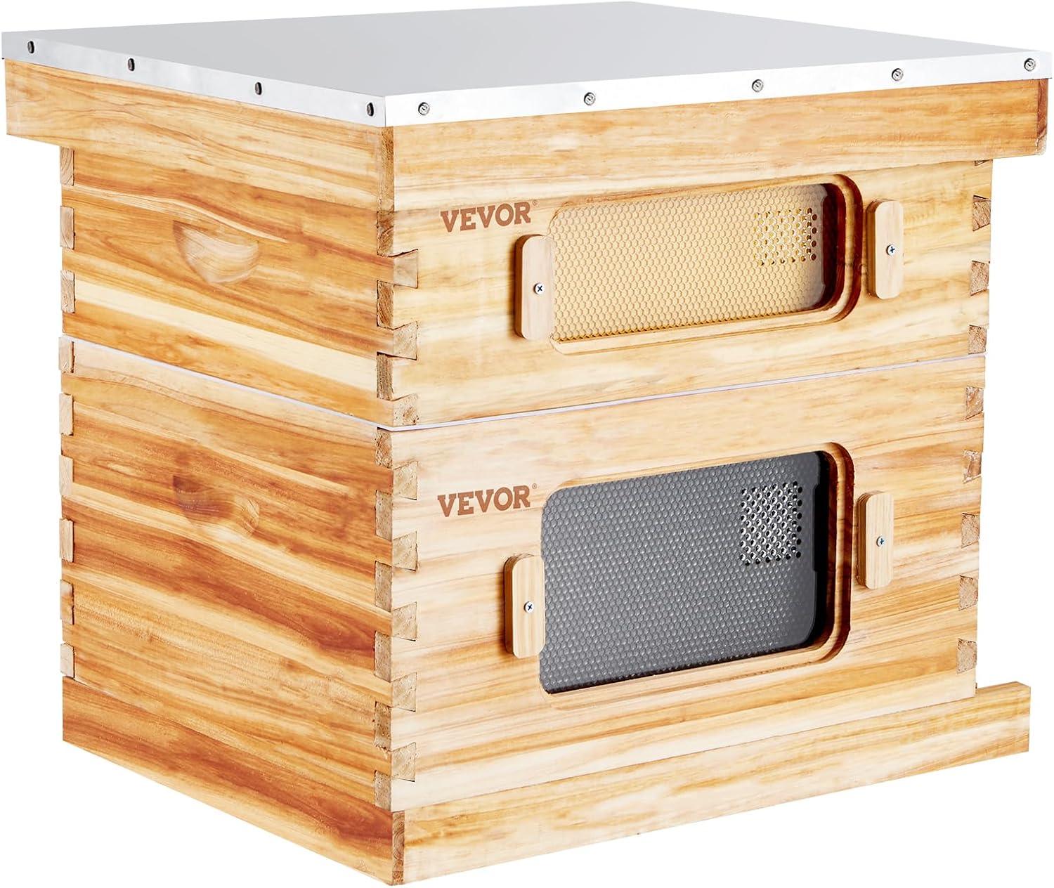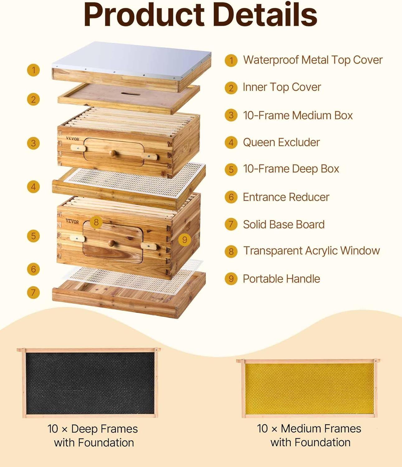 VEVOR 10 Frame Deep Brood Bee Hive Box, Bee Box Dipped in 100% Beeswax, Langstroth Beehive Kit with 10 Frames and Foundations Sheets and Transparent Acrylic Windows for Beekeeping Supplement(Deep Box x 1+ Medium Box x 1)