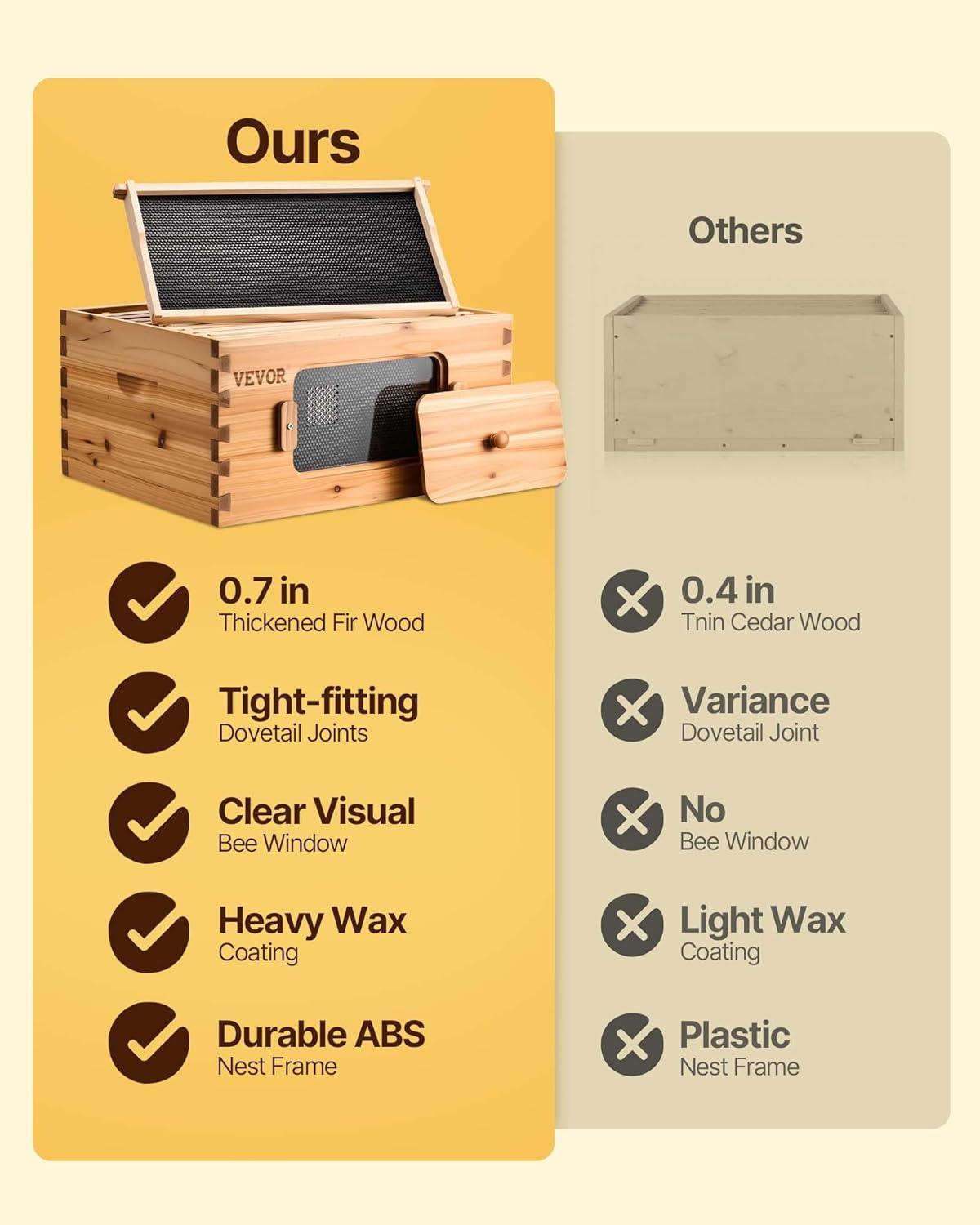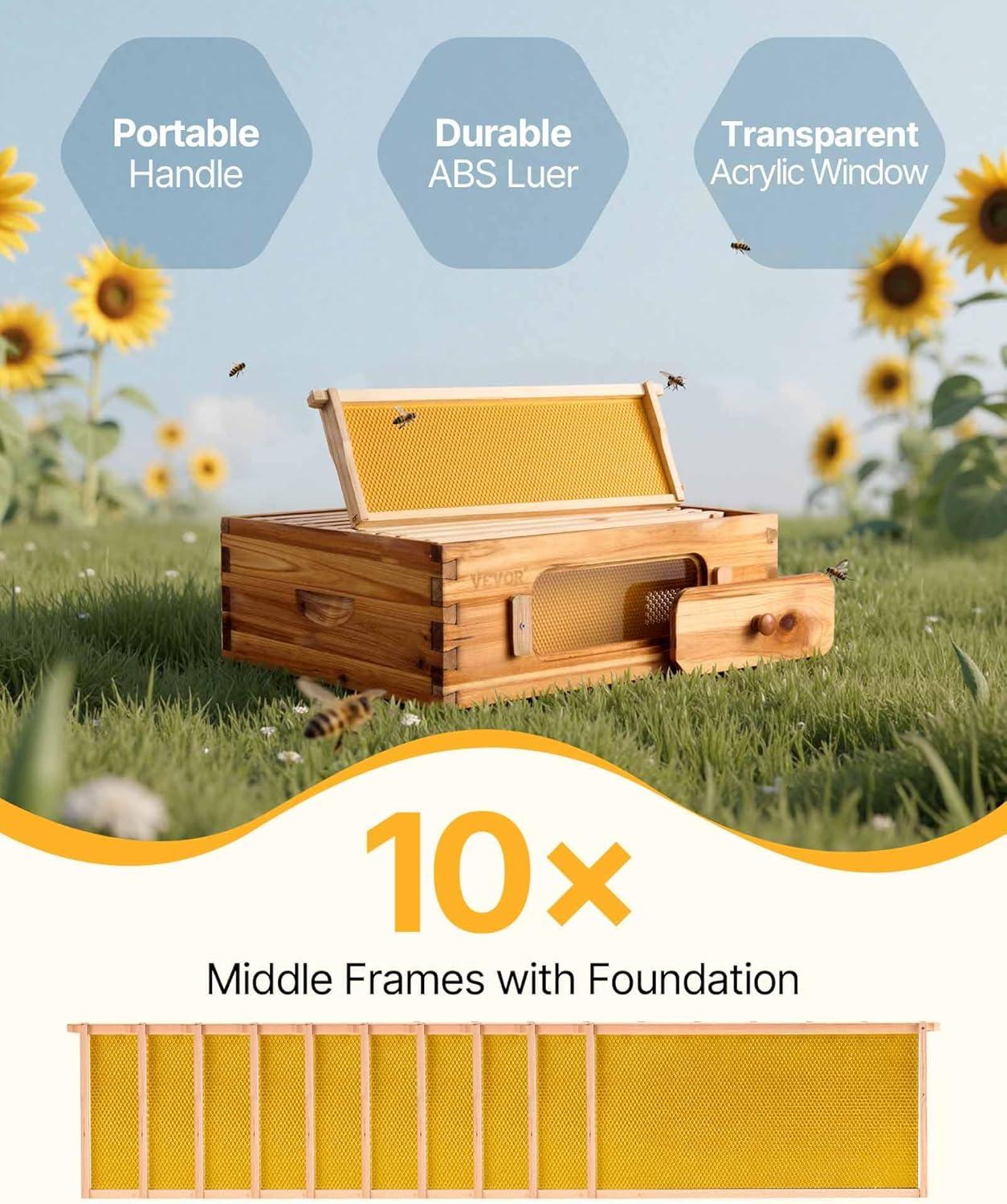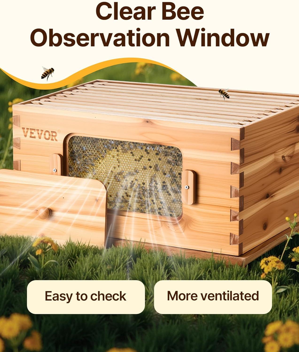 Don’t miss out on our limited-time offer: buy VEVOR 10 Frame Deep Brood Bee Hive Box, Bee Box Dipped in 100% Beeswax, Langstroth Beehive Kit with 10 Frames and Foundations Sheets and Transparent Acrylic Windows for Beekeeping Supplement(Medium Super Box), get {accessory} 50% off!