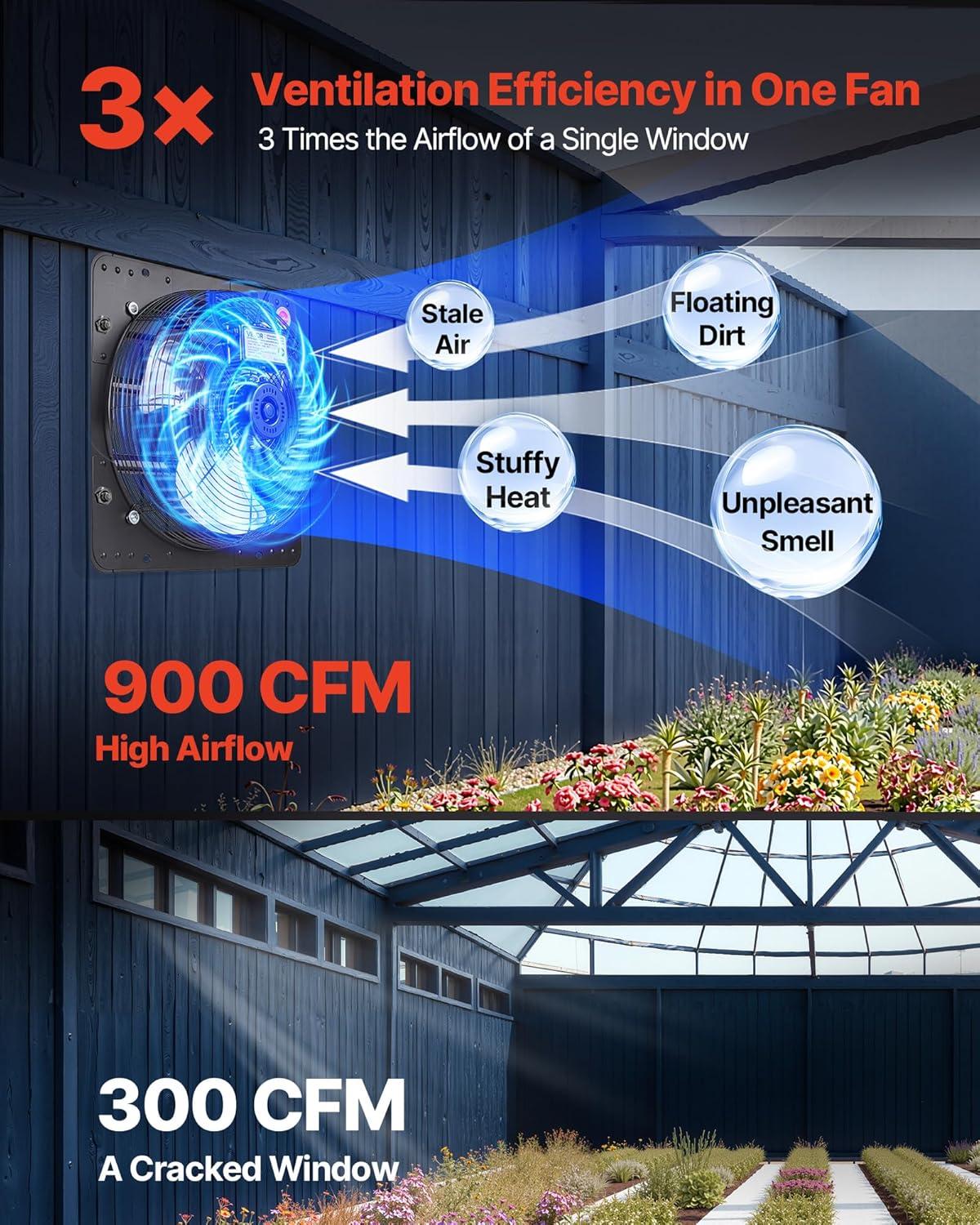Rapid Venting: This shutter exhaust fan delivers 900 CFM to quickly expel stale air, floating dirt, heat, and bad smells, keeping indoor air fresh. Also works as a high-airflow exhaust fan for sheds and workshops