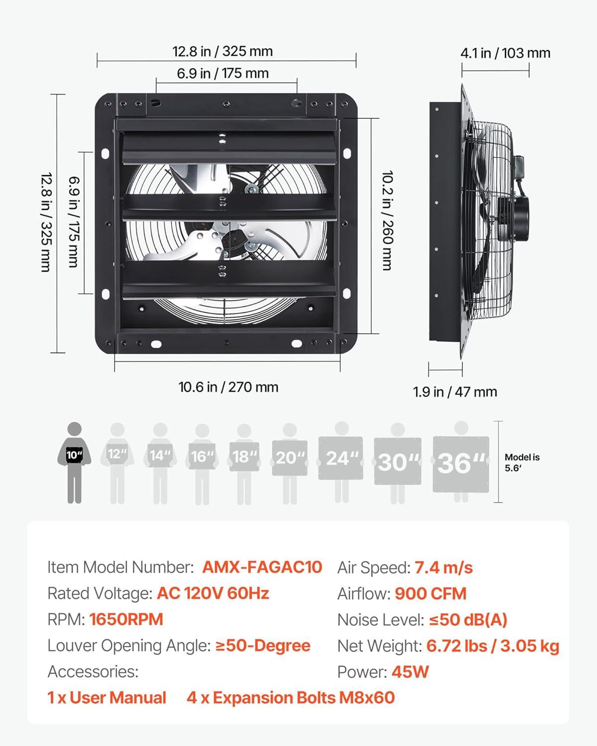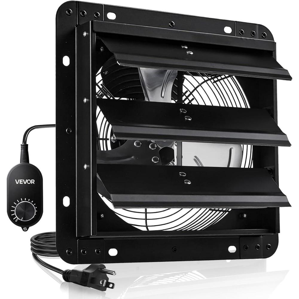 VEVOR 10 inch Shutter Exhaust Fan, Wall Mounted Attic Vent Fan with Variable Speed Controller, 900 CFM, AC Motor, Heavy-duty Steel, Low Noise for Shed, Garage, Greenhouse Ventilation Cooling, Black(12 Inch Fan w/ Speed Controller)