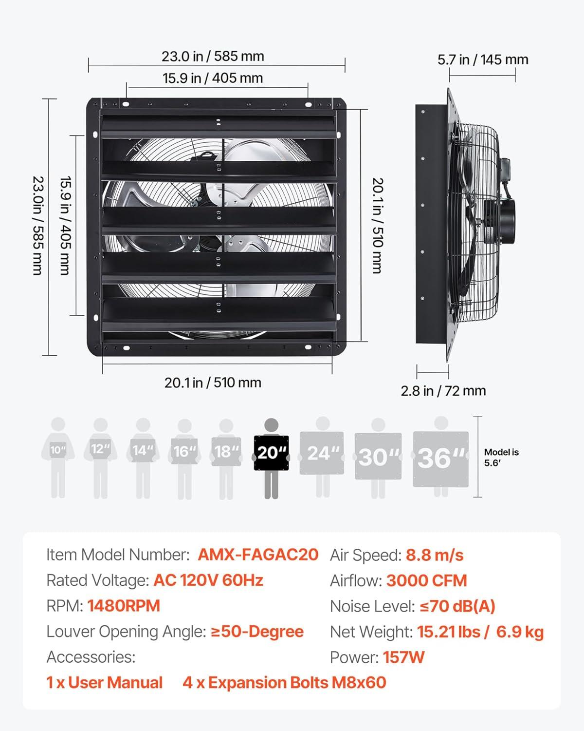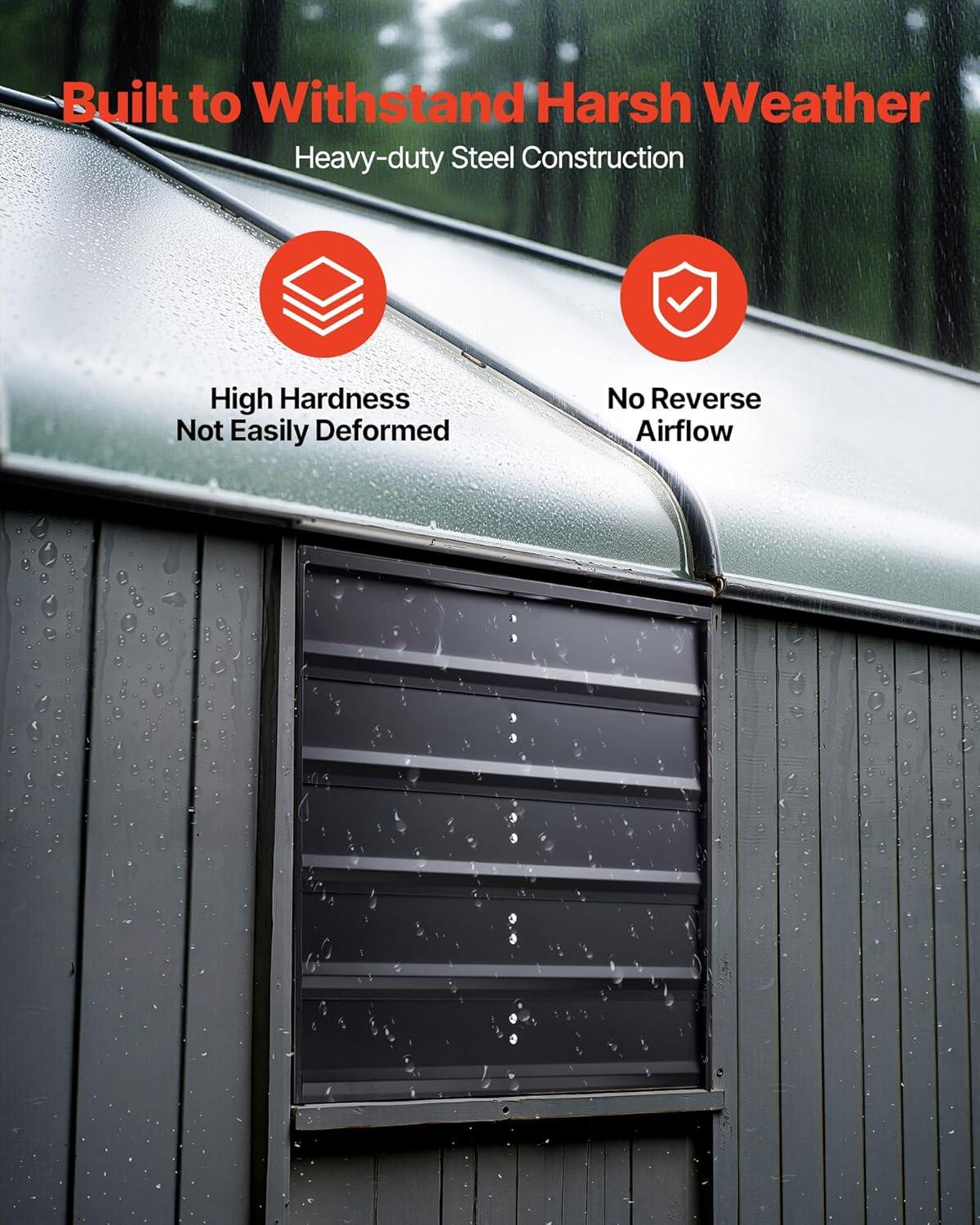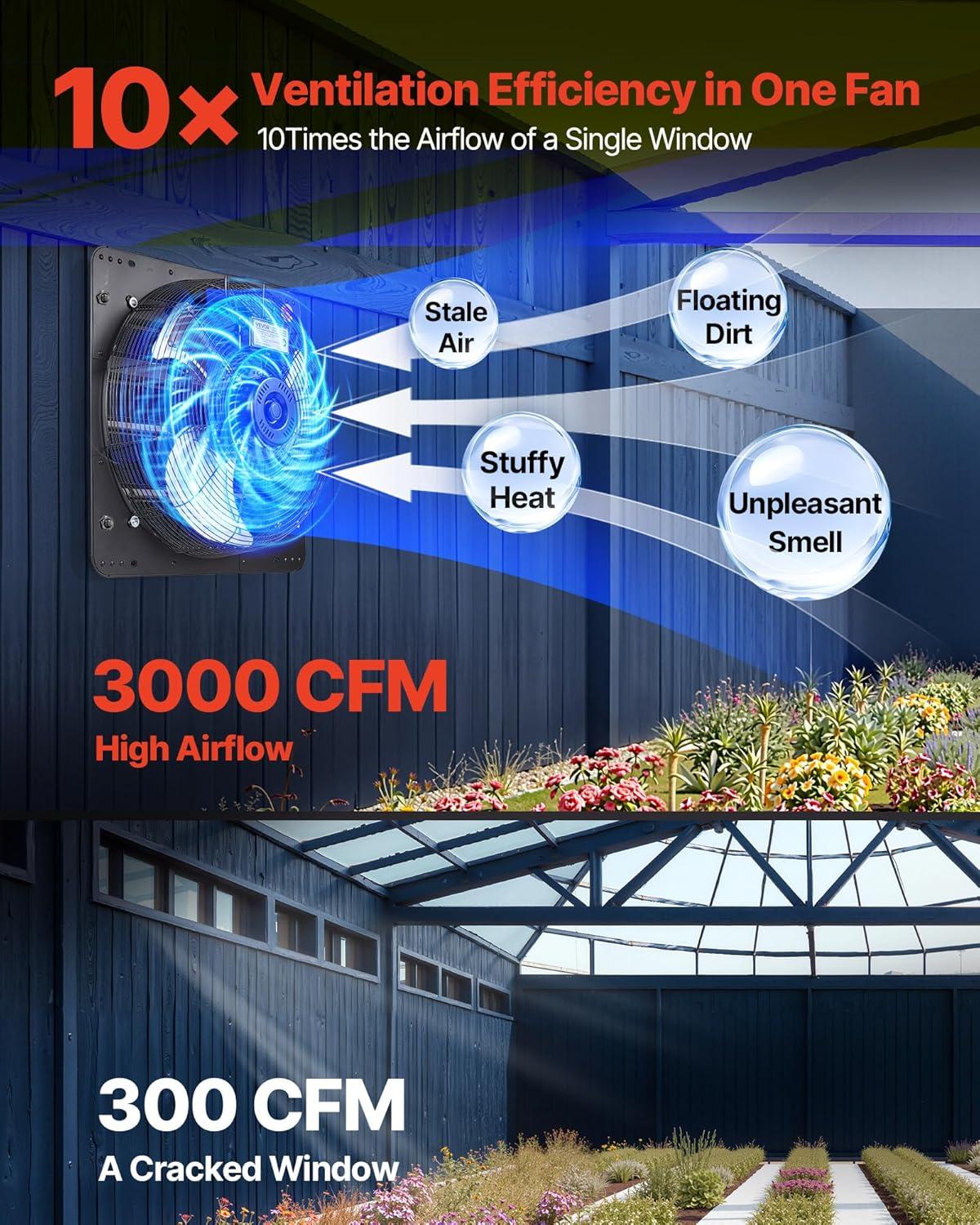 Rapid Venting: This shutter exhaust fan delivers 900 CFM to quickly expel stale air, floating dirt, heat, and bad smells, keeping indoor air fresh. Also works as a high-airflow exhaust fan for sheds and workshops