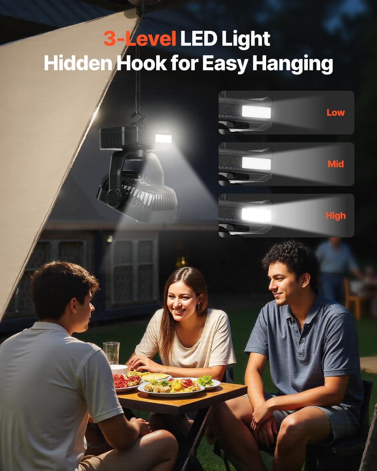 3-Level LED Lighting: Hidden hook design for convenient hanging, saving space while meeting outdoor lighting needs. This solar portable fan serves as both a fan and a light source for all your camping and outdoor adventures