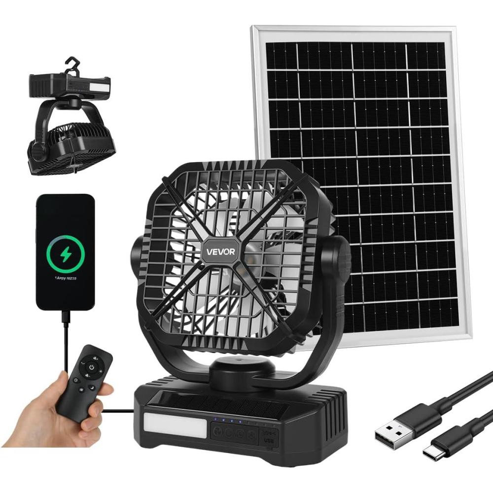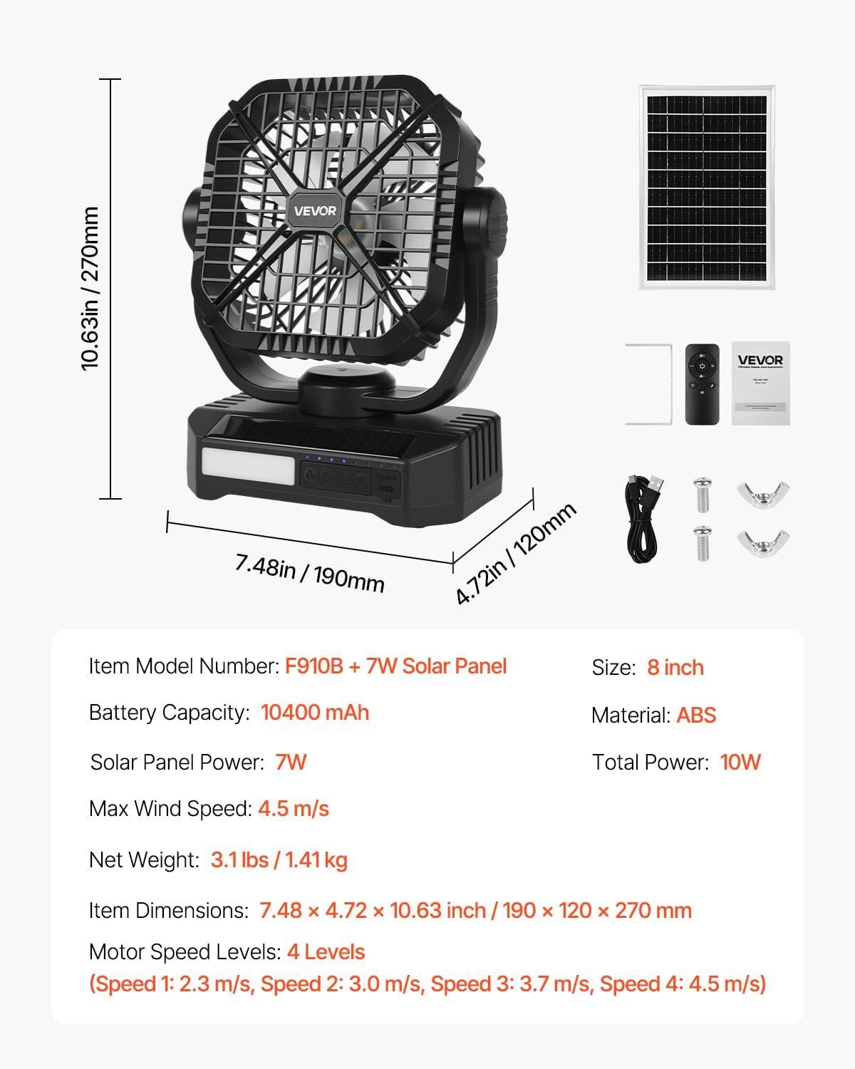 10400mAh Large Capacity Solar Portable Fan: Operates for 33 hours on low speed, 4 hours on high speed, and 13 hours in light mode, meeting all your outdoor needs. This portable solar fan is ideal for camping, picnics, and other outdoor activities