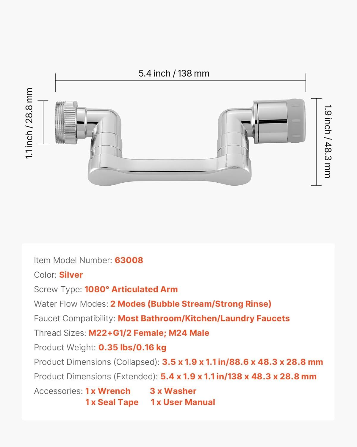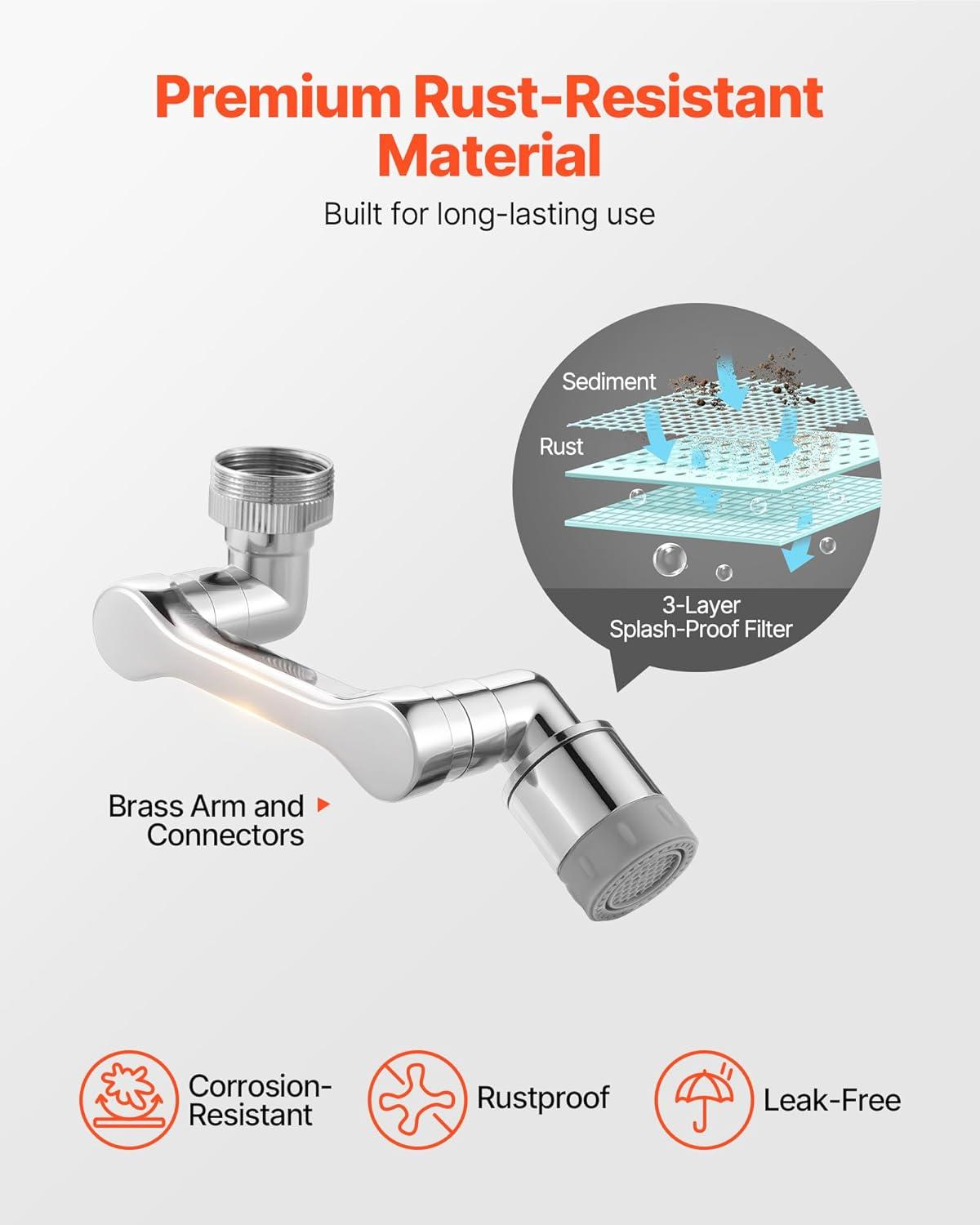 VEVOR 1080° Swivel Faucet Extender, 2 Sprayer Modes Sink Water Faucet Aerator Extension, Kitchen Bathroom Rotatable Spray Attachment with Brass Robotic Arm, Rotating Splash Filter Wash Hand/Hair/Face(Faucet Extender)