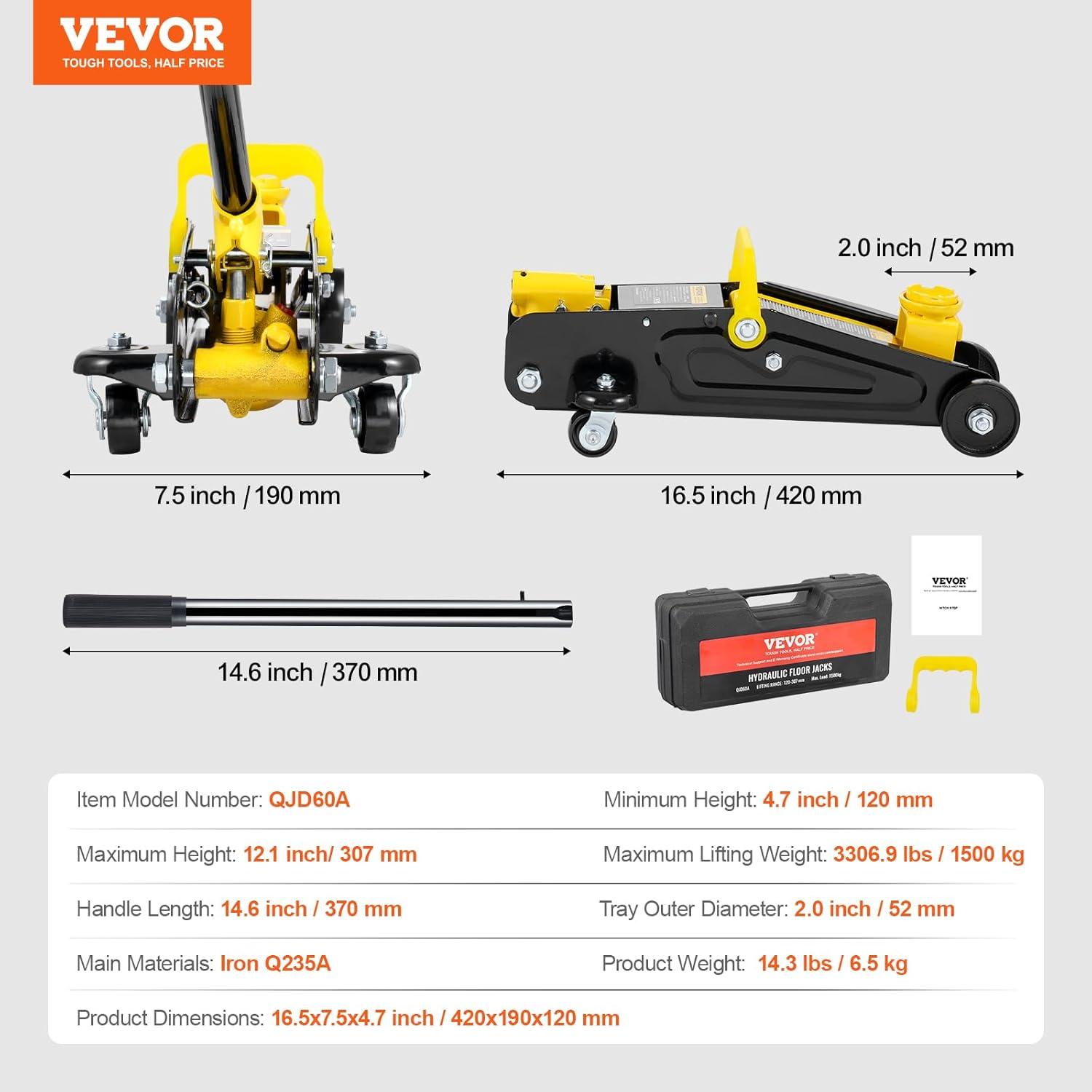 Jack it Up: With 2.5 tons/5500 lbs strong loading capacity, VEVOR's floor jack can help you raise your car for whatever reason. Replace a tire, change oil or maintain the brake, whether you are a professional, car enthusiast, or weekend DIYer to take matters into your own hands!