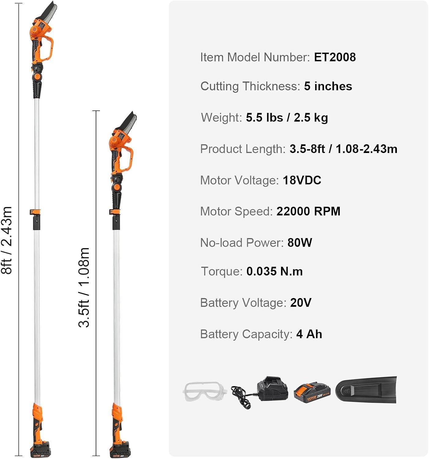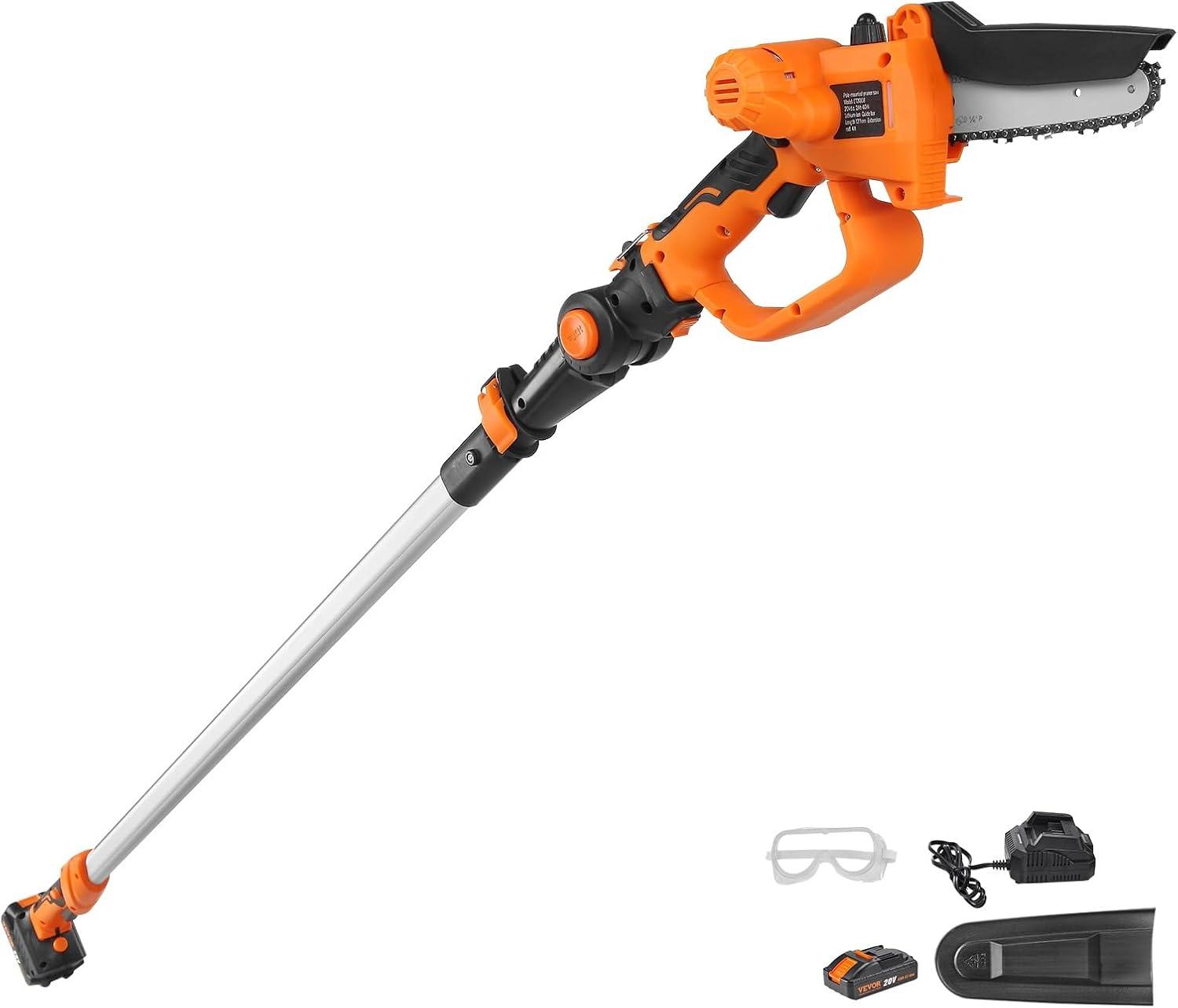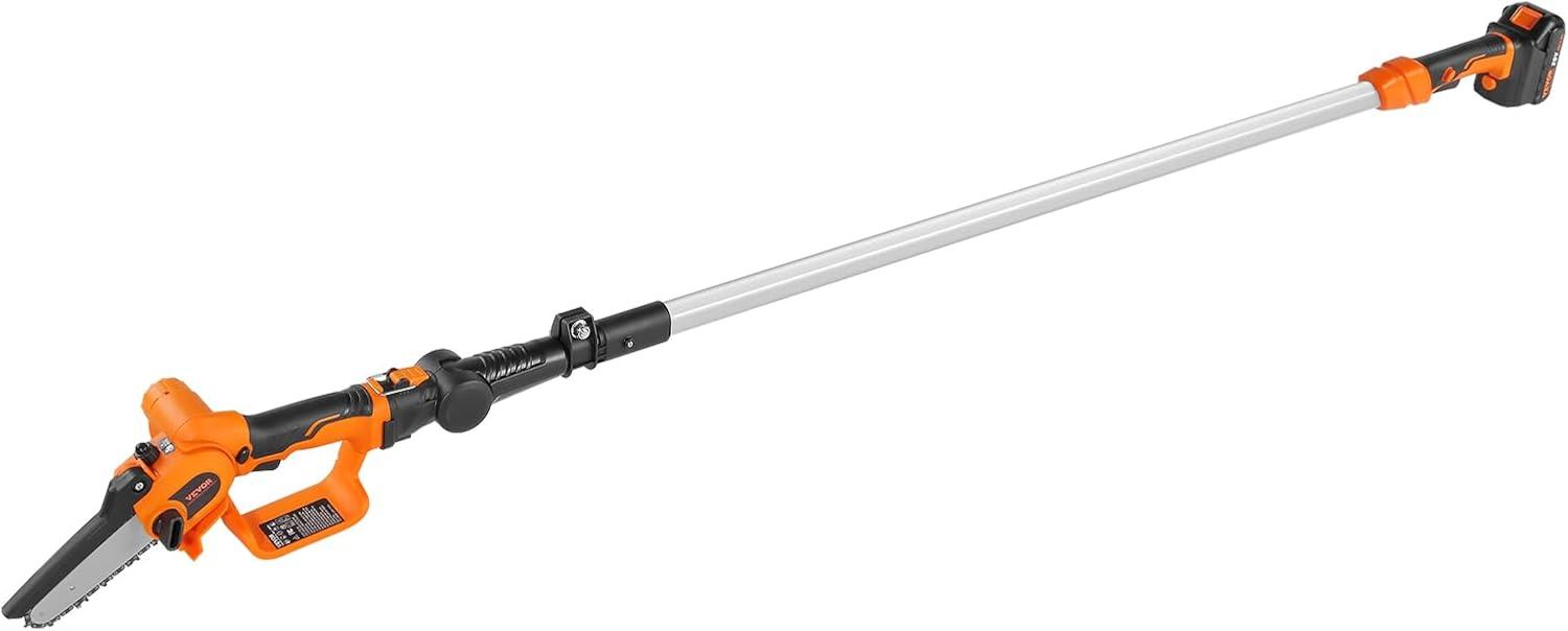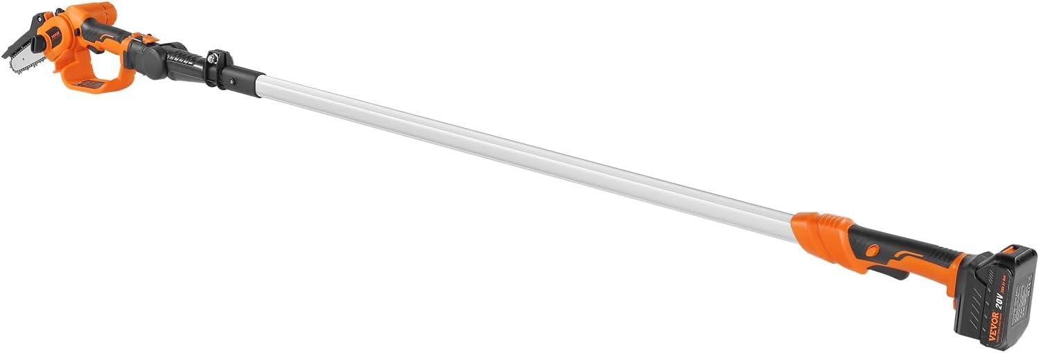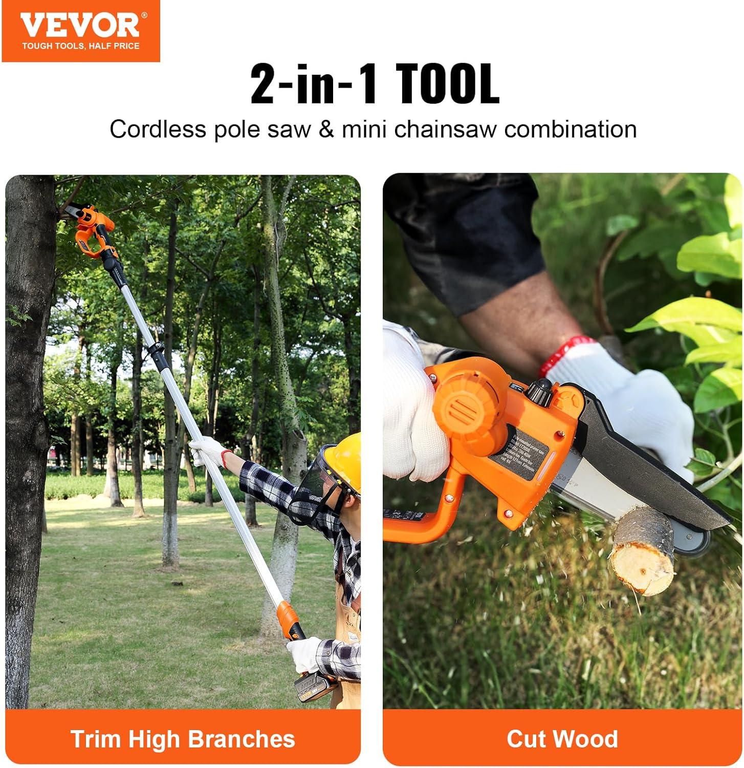 2-in-1 Cordless Pole Saw: The easily detachable extended cordless pole saw, combined with a mini chainsaw, makes it your perfect trimming assistant. The mini chainsaw is perfect for wood cutting and low bush trimming. Attach the telescopic pole for an extended reach without a ladder, allowing you to trim high branches efficiently.