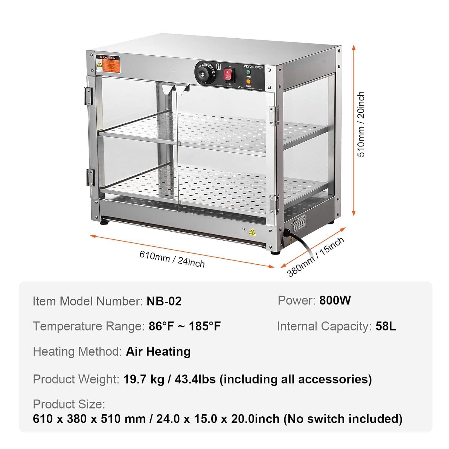 VEVOR 2-Tier Commercial Food Warmer Display, 800W Food Display Warmer with Light to Enhance Food Display, 86℉~185℉ Temperature Control, 58L Large Capacity for Hamburger, Pizza, Bread, Fried Chicken