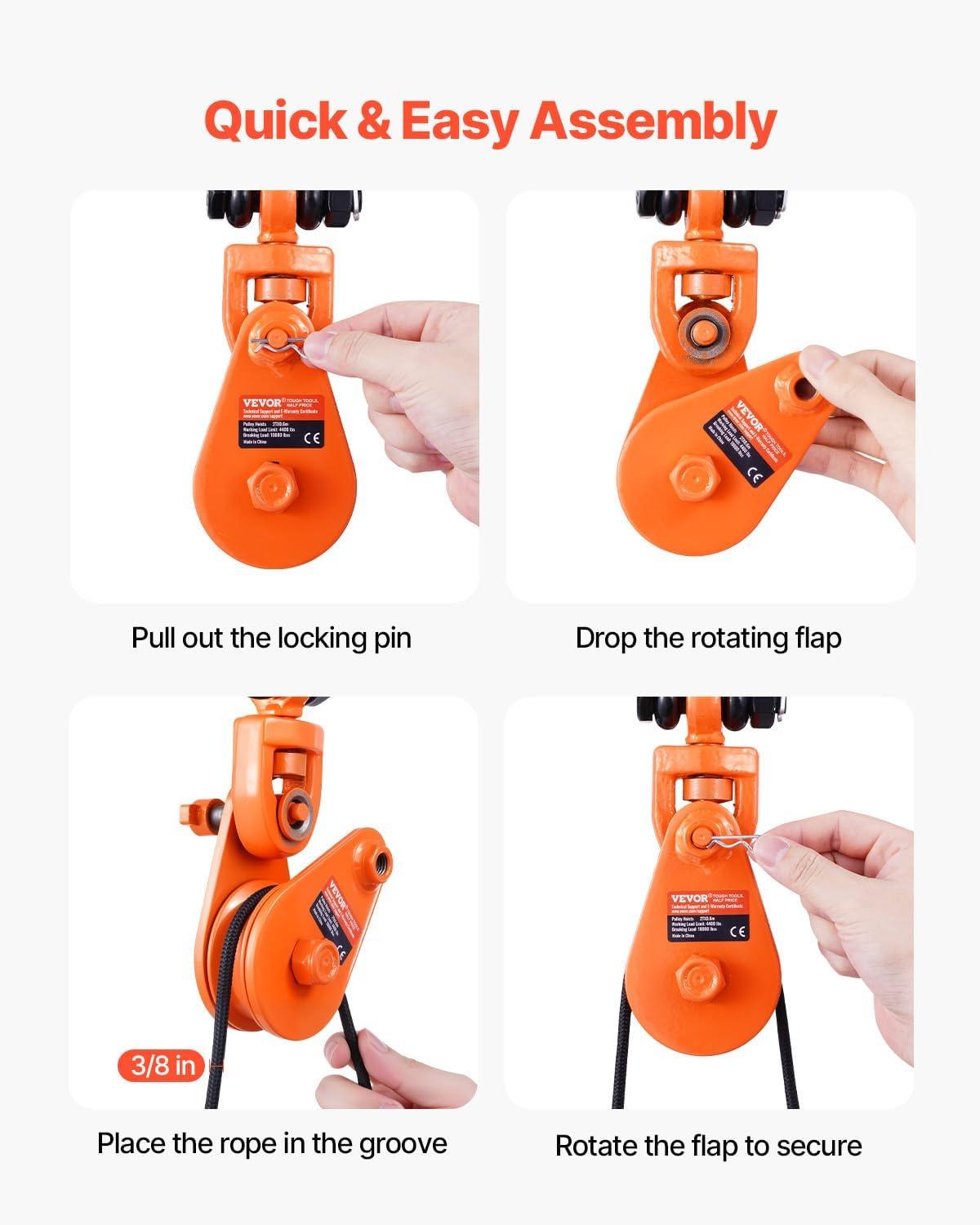 Easy to Use: Open the side panel of the pulley block and simply thread the lifting rope through—no more struggling to get the rope in place. It works with 3/8-inch cables, and you can easily inspect or swap out the rope as needed. One-person operation made easy!