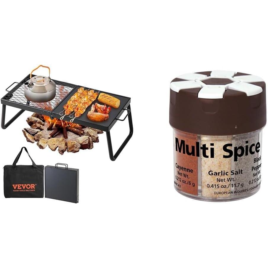 This versatile campfire cooking bundle includes a heavy-duty folding grill and a multi-spice shaker for flavorful meals around the campfire. The VEVOR Folding Campfire Grill provides a sturdy 22.4″ x 11.2″ cooking surface to grill meats and vegetables over an open flame. Made from premium steel, it withstands temperatures up to 572°F and supports up to 13 lbs. The half grill, half griddle design allows you to choose between direct grilling or using it as a griddle plate. It conveniently folds down in seconds and comes with a storage bag. To add zest to your campfire cuisine, the COGHLAN'S Multi-Spice shaker contains six popular spices each with a flip-top lid – Paprika, Curry, Cayenne, Garlic Salt, Black Pepper, and Salt. The segmented shaker makes it easy to shake out just the desired amounts. With the combined offering of a high-quality campfire grill and all-in-one spice shaker, this bundle has all you need for flavorful camp cooking and outdoor meals. The portable, durable grill folds up neatly when not in use while the spice set fits compactly in a backpack or camping kit.