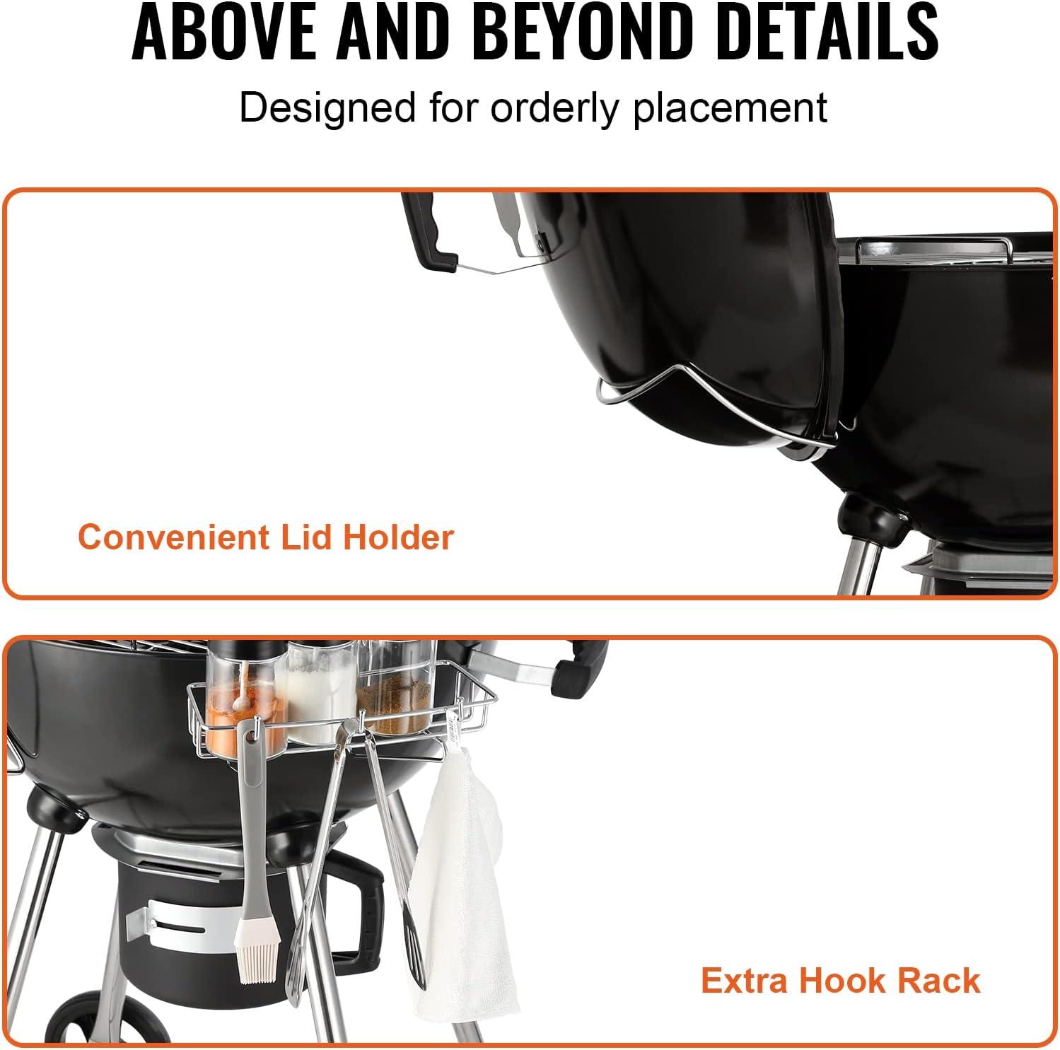 Orderly Placement: The hassle of outdoor cooking is no longer a challenge! With lid holder and hook rack, you can avoid placing the lid on the ground, and expand your bbq grilling surface and keep all your ingredients and condiments close at hand.