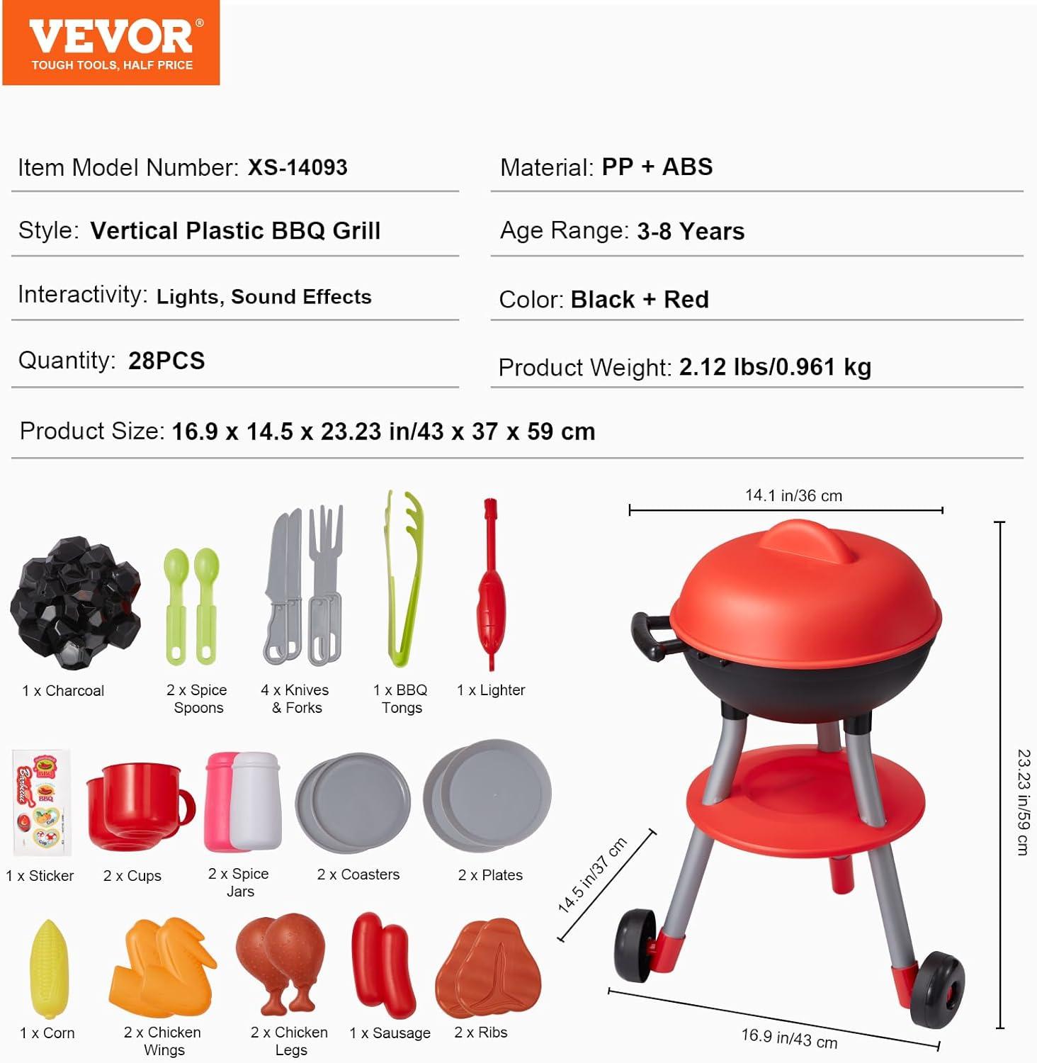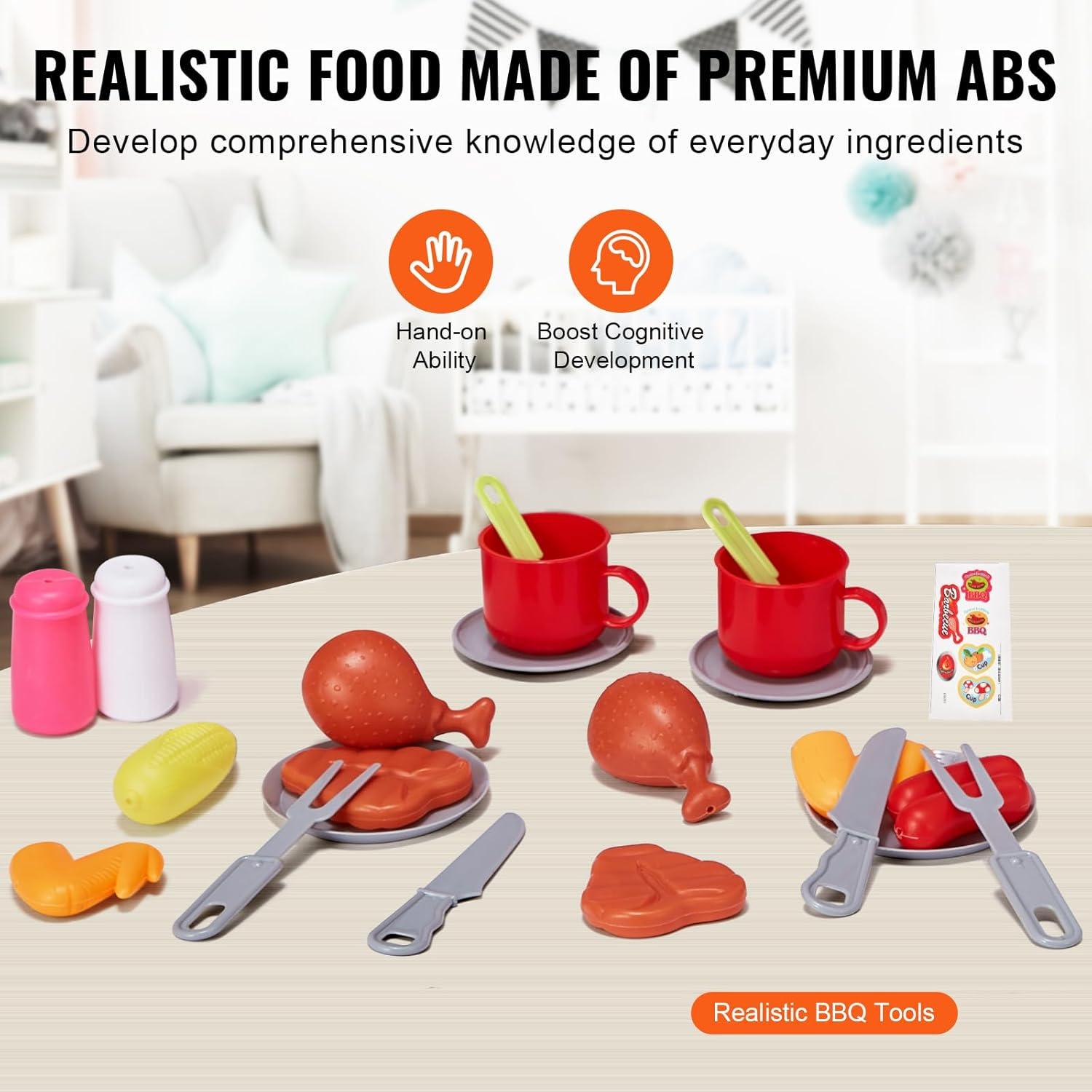 28 PCS Grill Playset: This realistic toddler grill playset includes everything kids need for hours of imaginative play. It comes with 2 ribs, 1 sausage, 1 corn, 2 chicken wings, 2 chicken legs, 2 spice jars, 1 sticker, 2 coasters, 2 plates, 4 knives & forks, 1 lighter, 2 cups, 2 spice spoons, 2 wheels, 1 charcoal, and 1 BBQ tongs. Kids can mix and match the toy food and accessories to create their own grilling adventures, boosting their creativity and sorting skills.