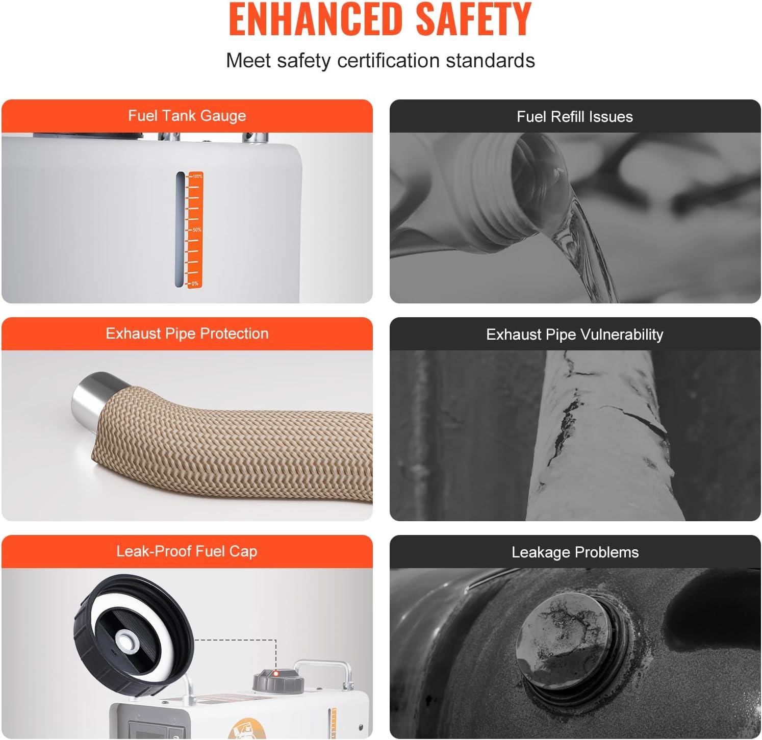 Innovative CO Alarm System: Our diesel heater features enhanced safety with a built-in CO alarm that continuously monitors CO levels, providing alerts or auto shut-off when needed. Additional upgrades include a leak-proof fuel tank cap, fuel level indicator, and overheat protection—ensuring peace of mind during extended use.