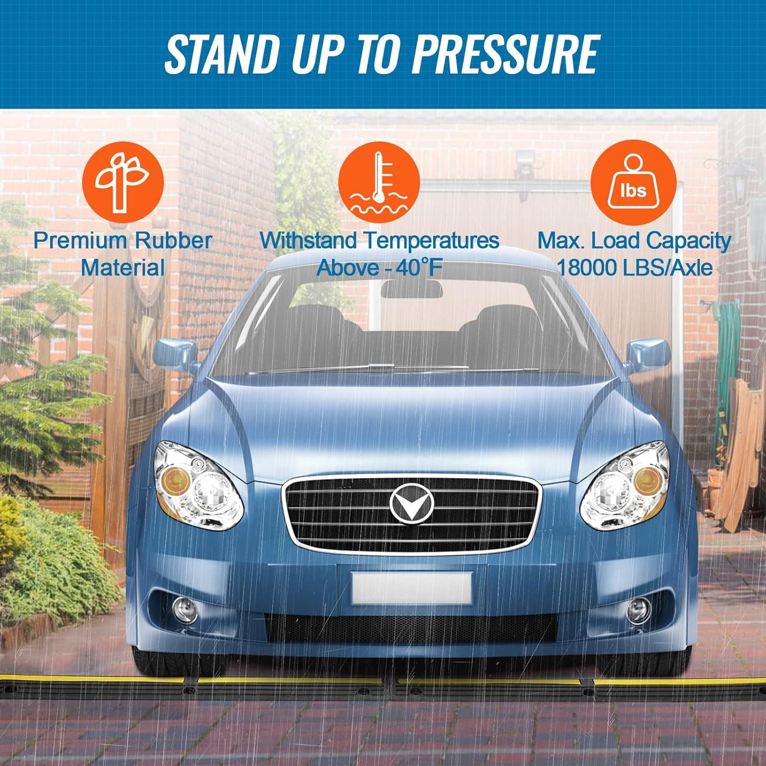 Security You Can Trust: This hose protector ramp boasts 18,000 lbs/axle maximum load capacity for vehicles to pass by easily. Speed bumps for road features eye-catching yellow stripe and good reflexivity to enhance the passers-by’s security. The anti-slip texture enhances friction and stability, so your cable floor runner will be where you left it!