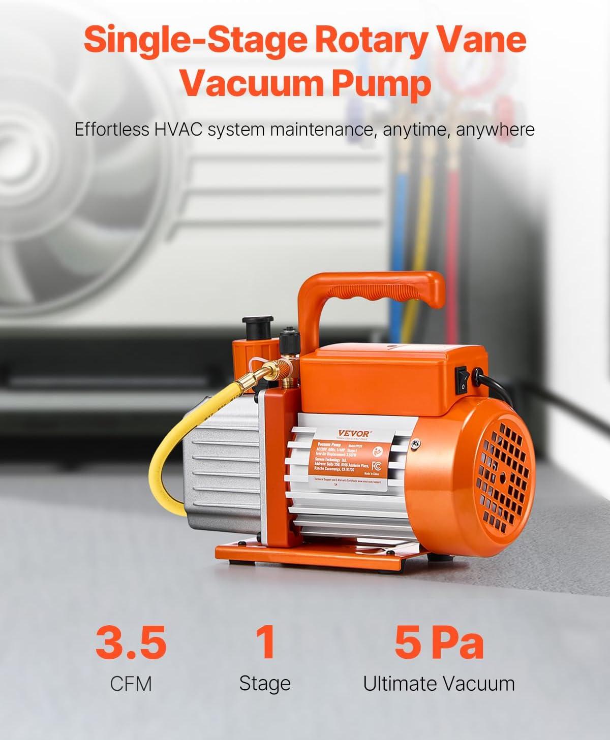 VEVOR 3.5 CFM Vacuum Pump, 1-Stage HVAC Vacuum Pump with Oil, AC Vacuum Pump 134a, 4-Pole Pure Copper Motor-Longer Running Time, for Resin Degassing, Refrigeration Maintenance, Vacuum Package etc.(3.5CFM 1-Stage Pro)