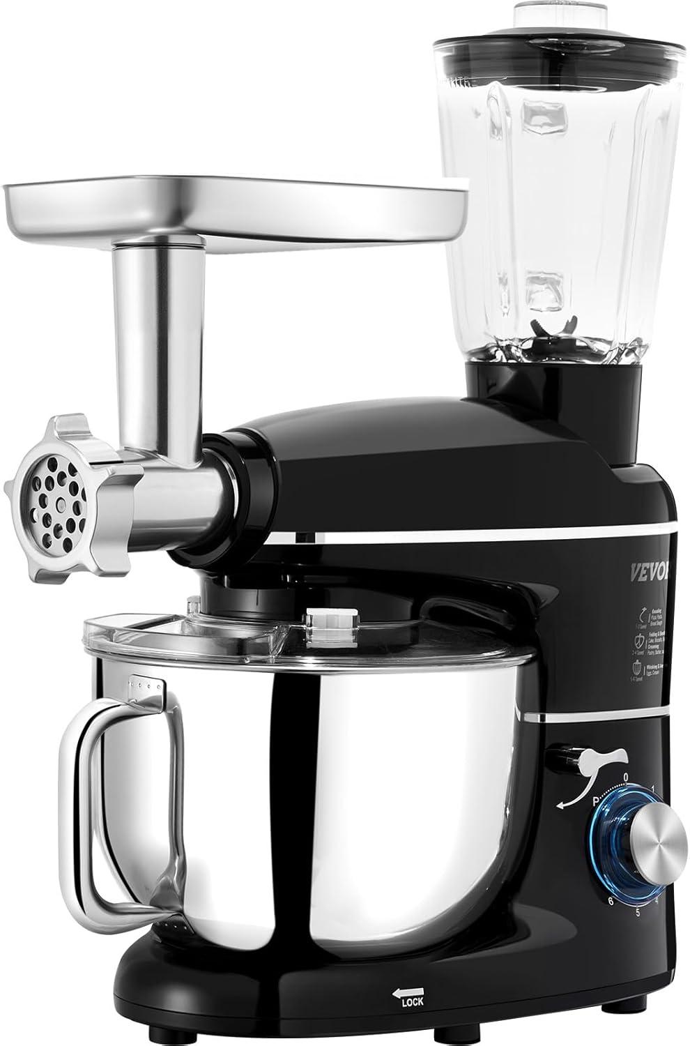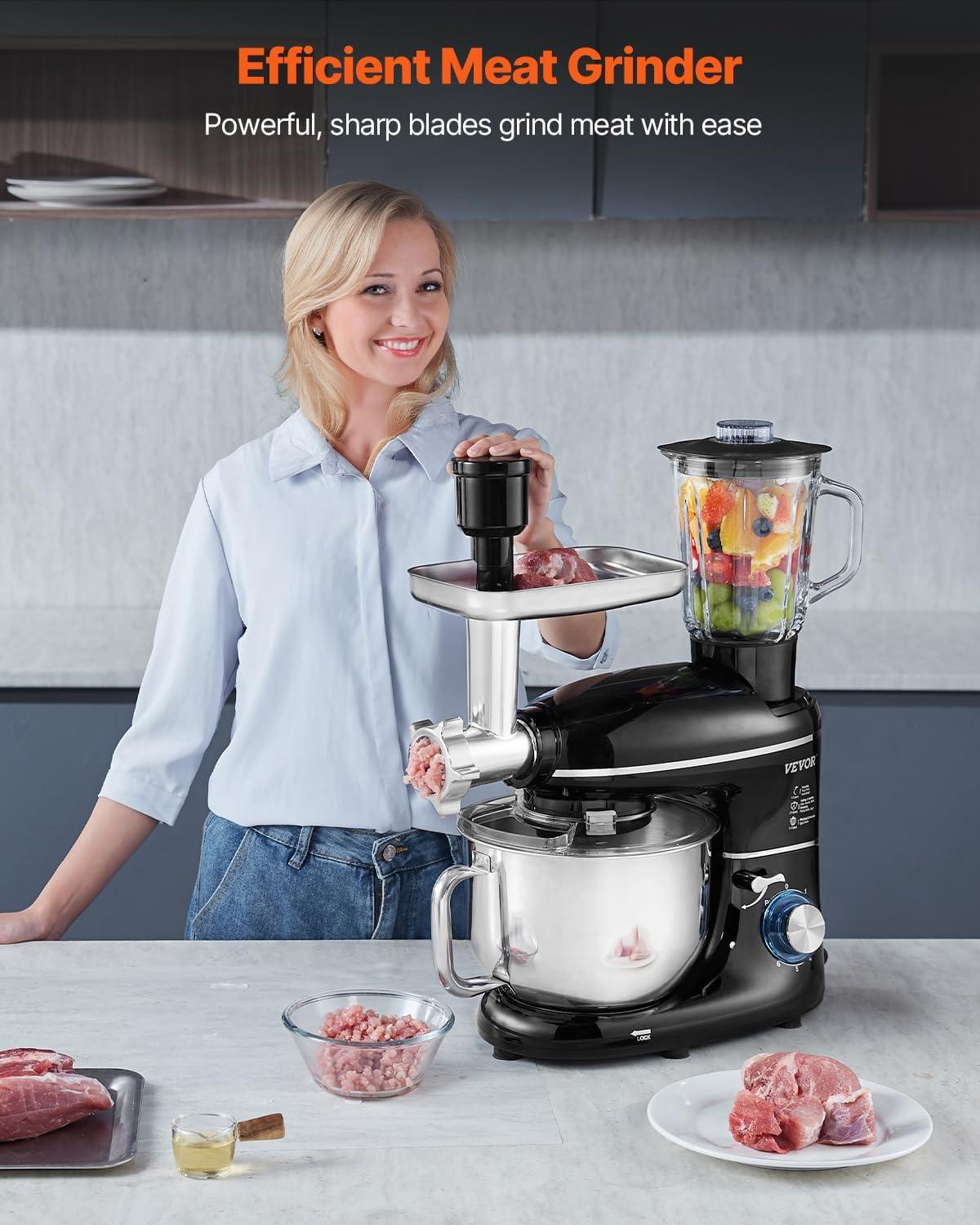 3-in-1 Commercial Stand Mixer: Our 3-in-1 stand mixer combines multiple functions to make your food prep easier. It includes an aluminum dough hook for kneading, a stainless steel wire whisk for whipping and mixing, and an aluminum beater for versatile mixing tasks. Also, use the meat grinder for sausages and burgers and the 1.5 L juice blender for fresh smoothies. Really an all-in-one tool for busy kitchens!