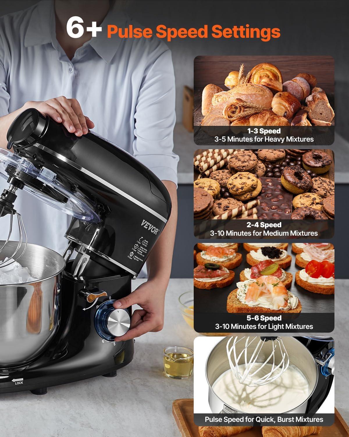 High-performance Mixing: With the powerful 660W motor and reliable gear-driven system, this electric food mixer ensures quick, uniform mixing in 3-10 minutes. Choose from 6 adjustable speeds and a pulse setting to get your desired result every time. Use speeds 1-3 for dough, 2-4 for fillings, and 5-6 for whipping cream. Note: Always stop the machine before changing speed.