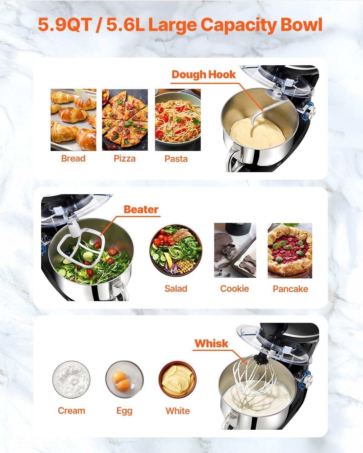 Large Bowl & 3 Attachments: Our commercial food stand mixer includes a spacious stainless steel bowl of 5.9 qt (5.6 L) and 3 mixing attachments: a dough hook for effortlessly kneading pizza or other heavy dough, a flat beater for whipping up mashed potatoes, cake batters, or frosting, and a whisk for creating light mixtures like fluffy whipped cream or egg whites.