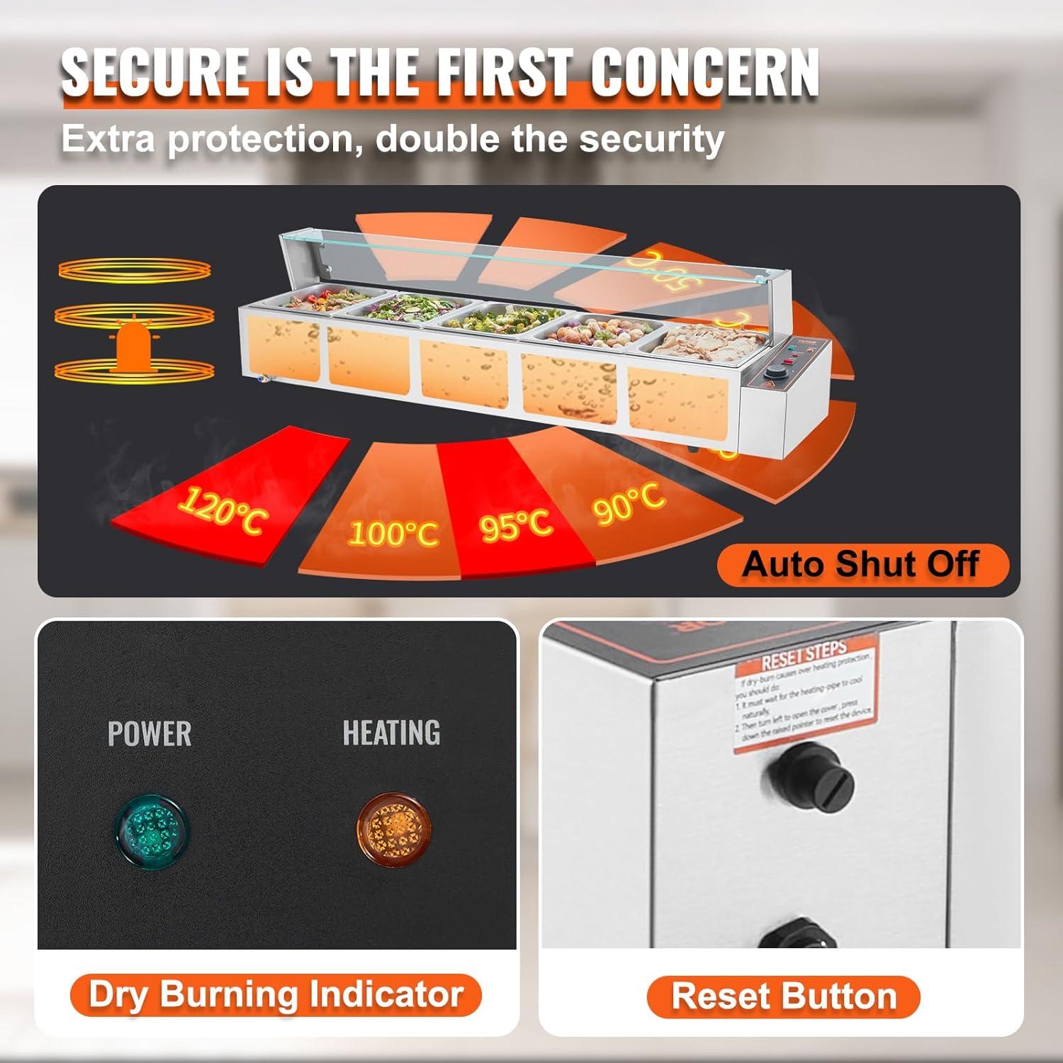 Additional Security: We have upgraded our food warmer with newly designed “Dry Burning Indicator” and “Reset Button”. The dry-burning indicator function automatically stops heating the food when the temperature exceeds 248°F (120°C). To resume operations, you need to press the Reset Button.