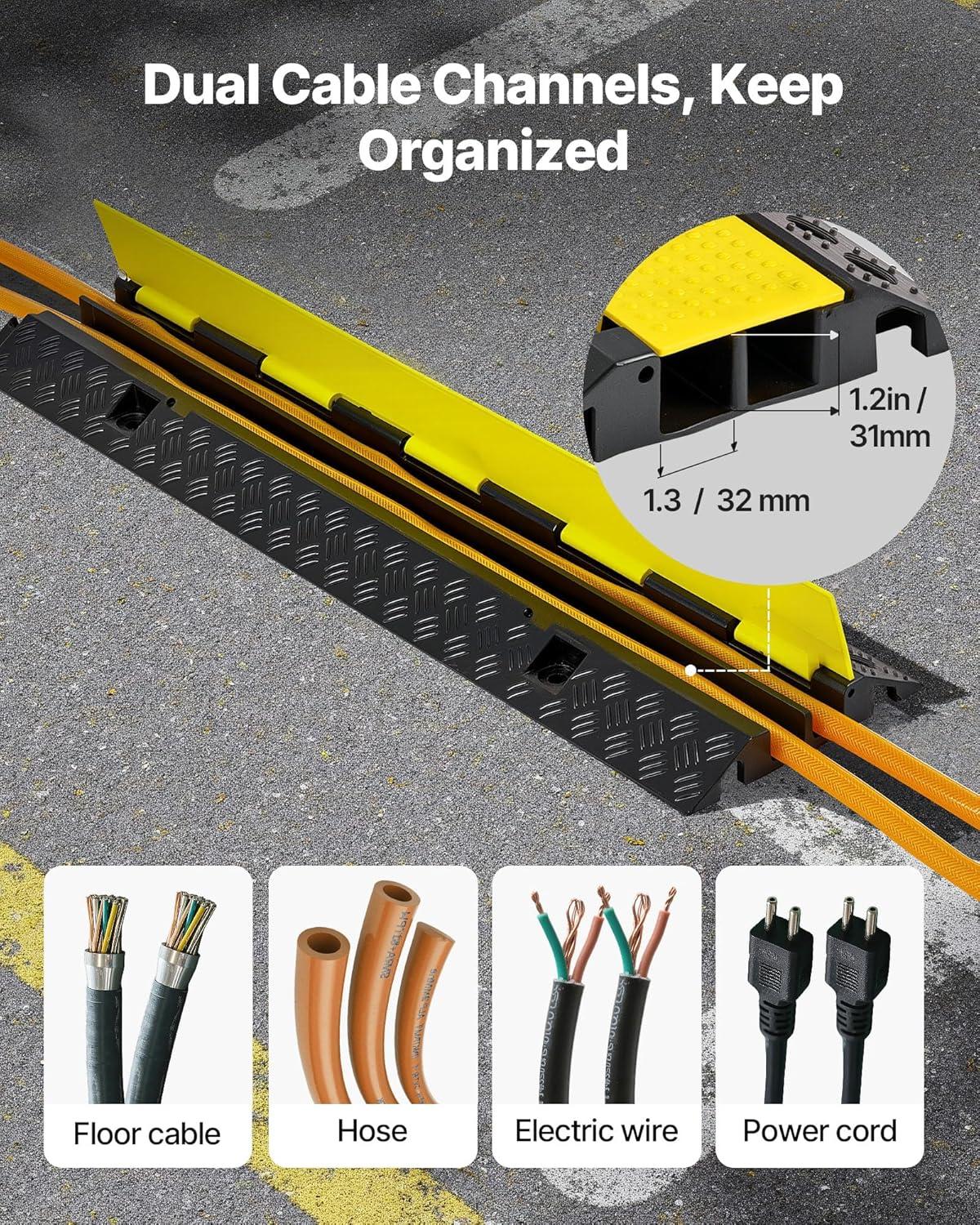 3 Pack 2 Channel: Are you tired of tangled wires? Well, get ready to avoid an accident before it happens! You will receive 3 packs of cable protector ramps measuring 38.58 x 9.45 x 1.77 in. The Dual 1.18 x 1.18 in channel groove design provides enough space for electrical wires, power cords, hoses, and floor cables, protecting them from pedestrians and vehicles.