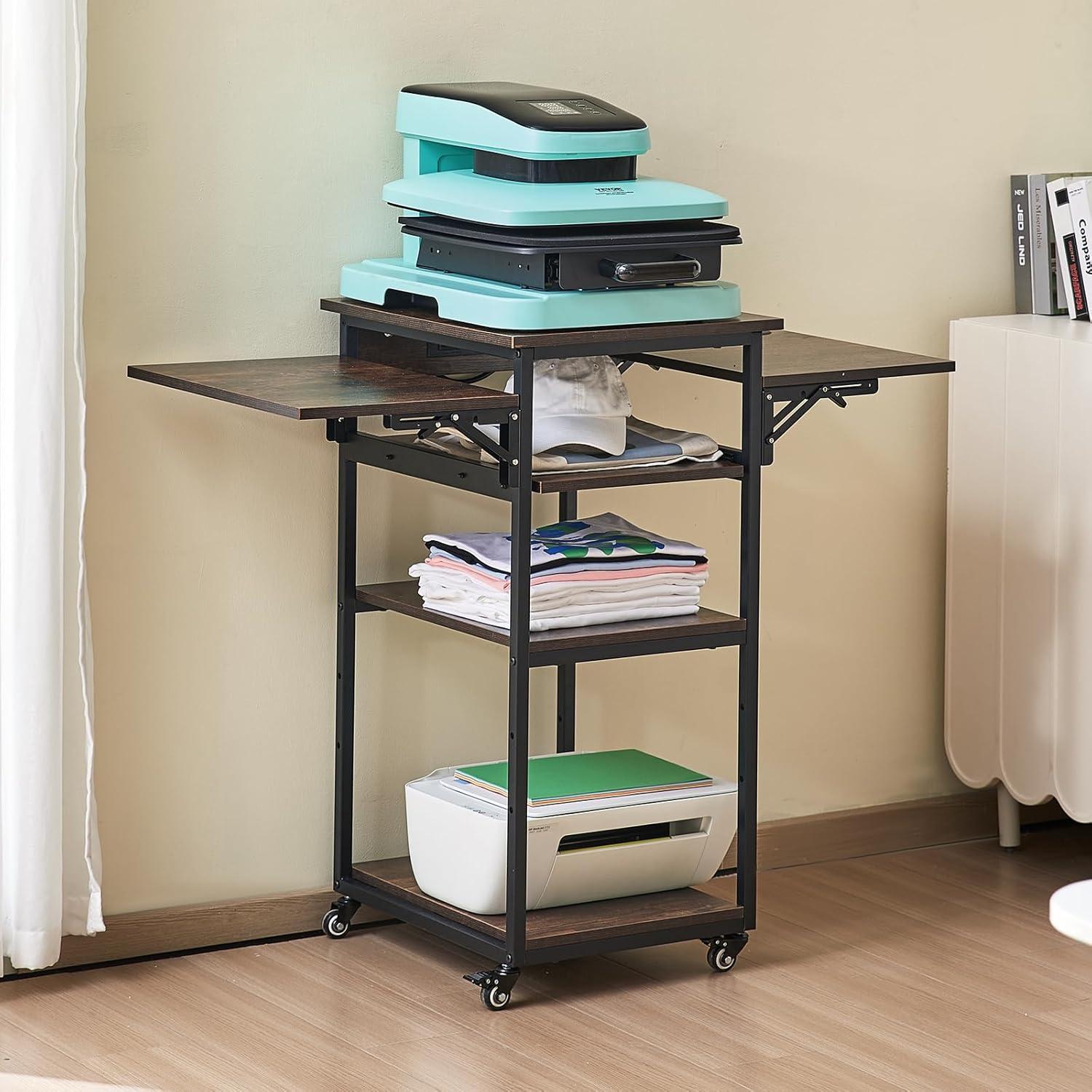 VEVOR 3 Tier Movable Heat Press Table, Foldable Heat Transfer Machine Stand with Vinyl Roll Holder, Heavy Duty Rolling Metal Workbench for DIY Sublimation Transfer Machine and Printer(4 Tier – Brown With Charge Station)
