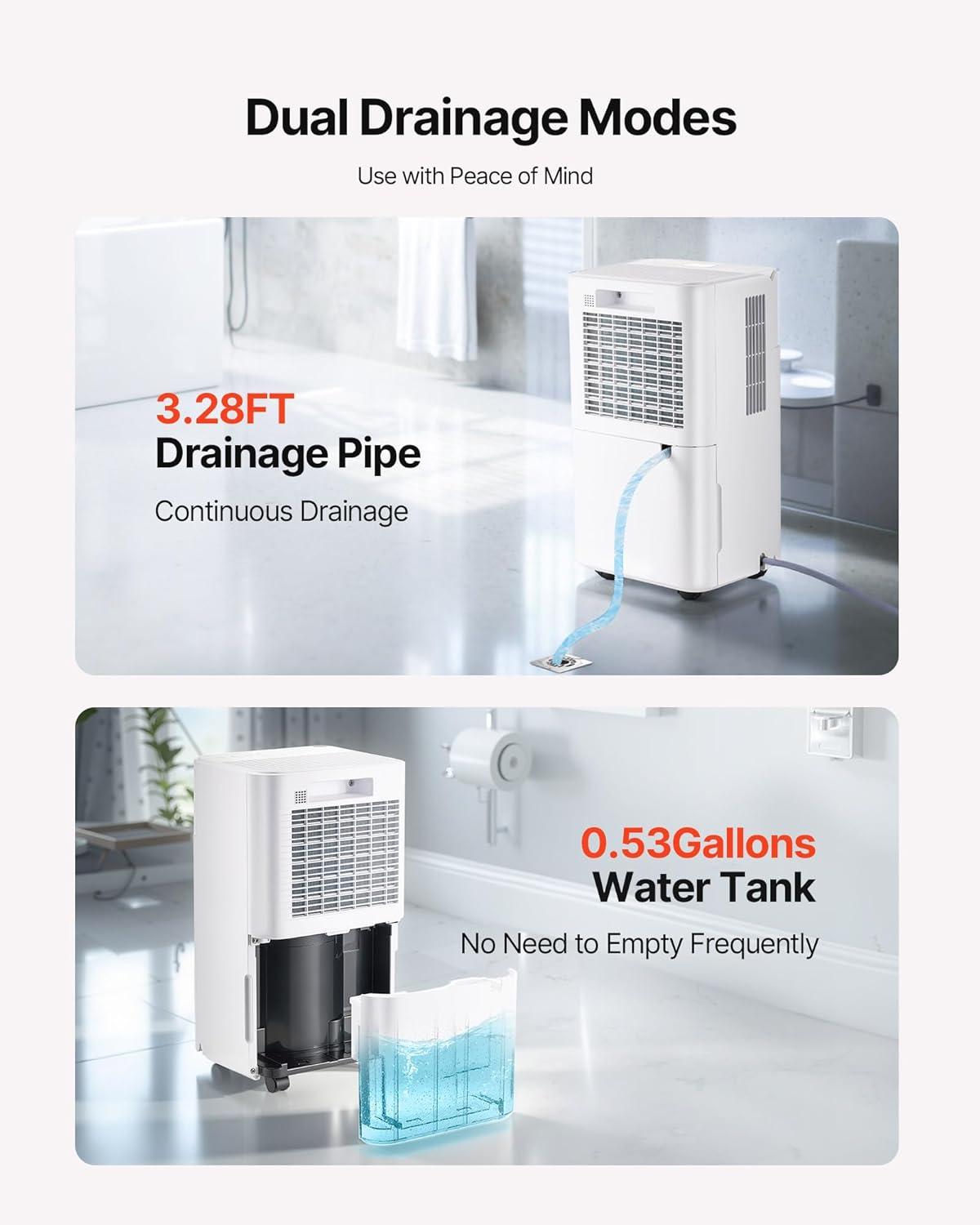 Dual Drainage Modes: Connect a hose for continuous drainage or use the water tank for collection. The dehumidifier alerts you when the tank is full, avoiding overflow and making it hassle-free