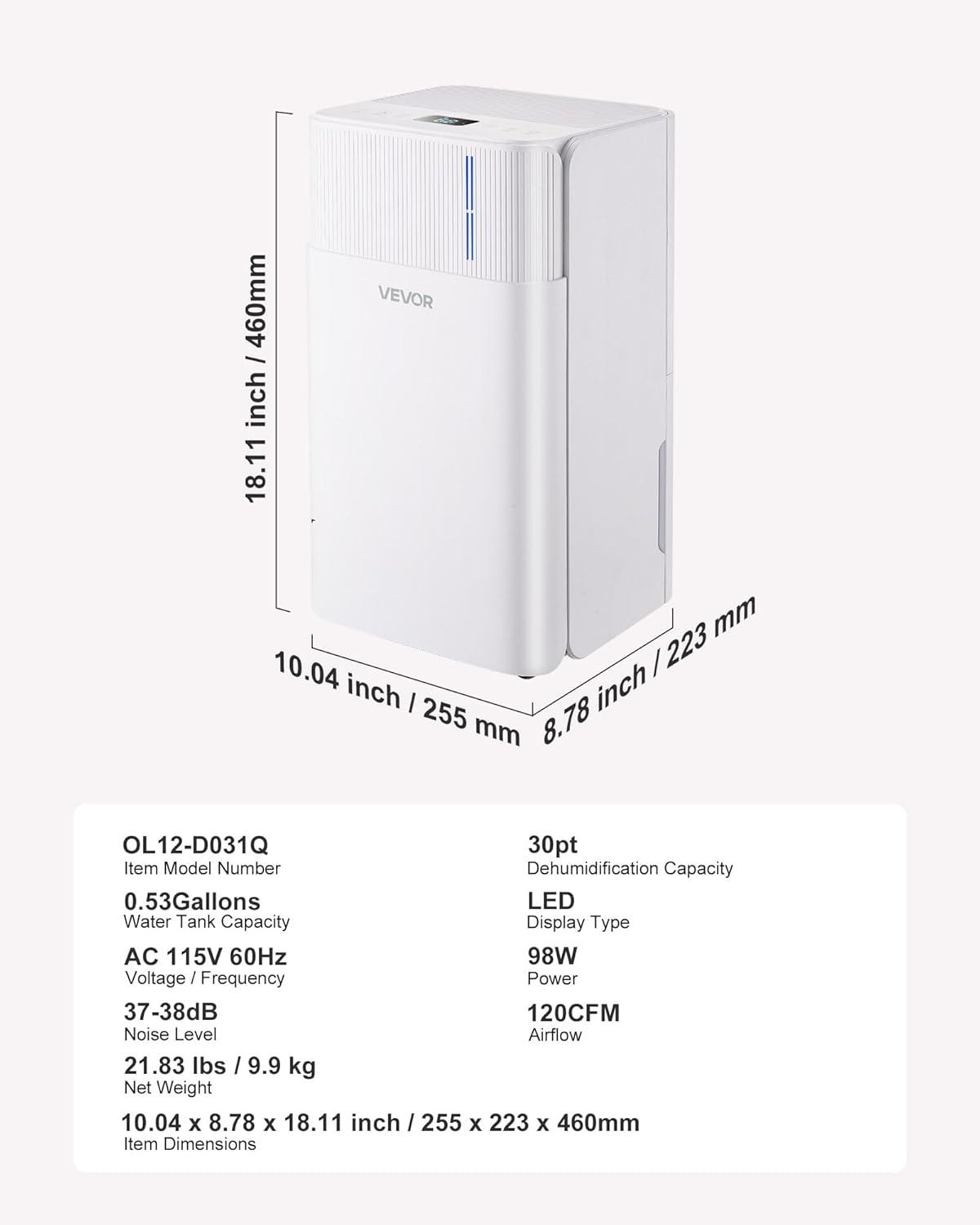 VEVOR 30 Pints Dehumidifier for Home & Basement, 1500 Sq.Ft Large CoverageDrain Hose for Commercial & Industrial Use, Smart Humidity Control, Low Noise for Large Rooms, Warehouses, Bedrooms & Storage(30 Pints)