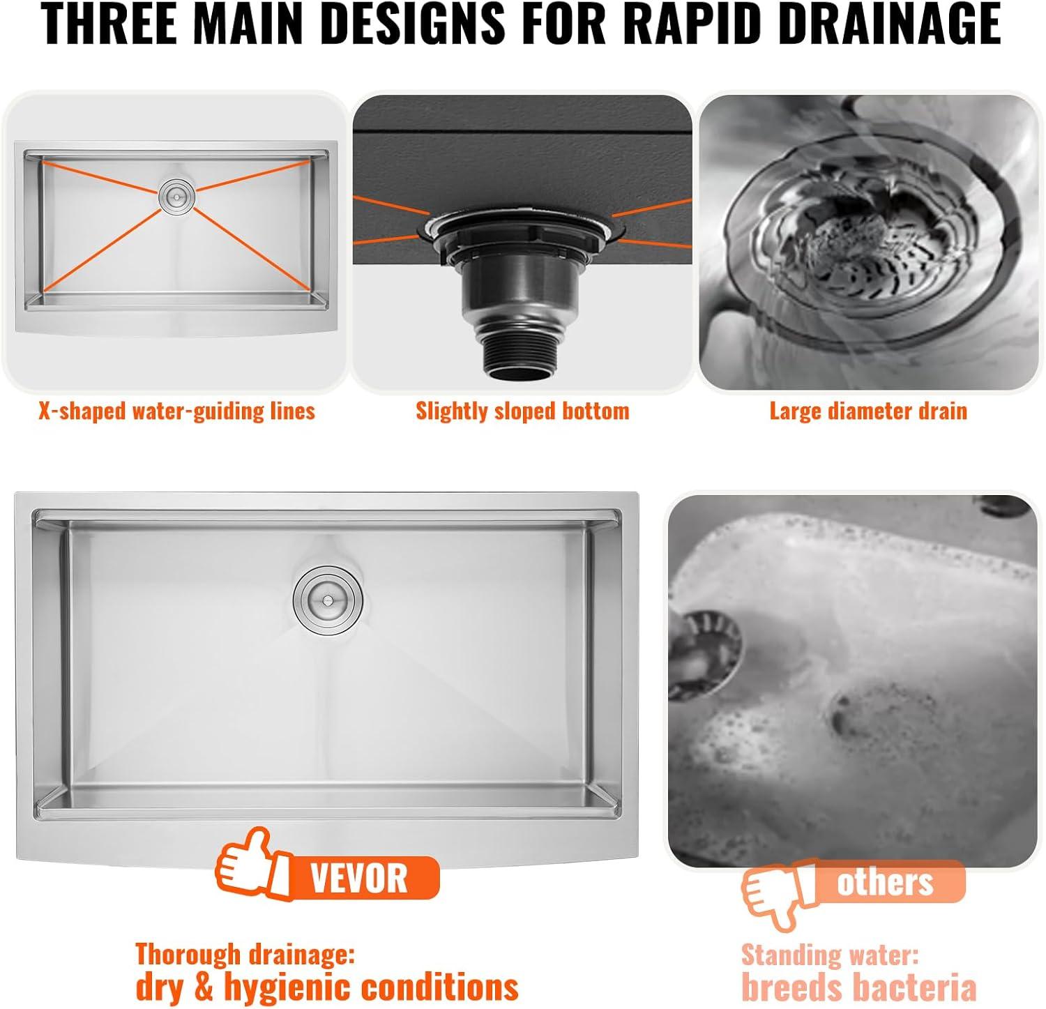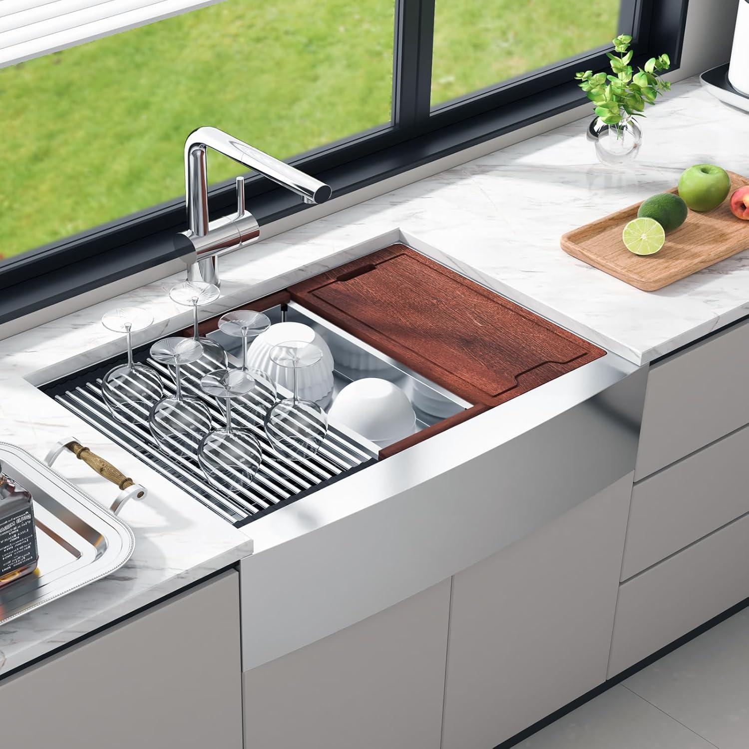 33″ Large Dimension: Our farmhouse kitchen sink features a front apron design, offering enhanced aesthetics and more usable space. You can simultaneously wash, drain, and chop, easily accommodating and cleaning large dishware. Moreover, it tackles the hassle of water splashing during washing.