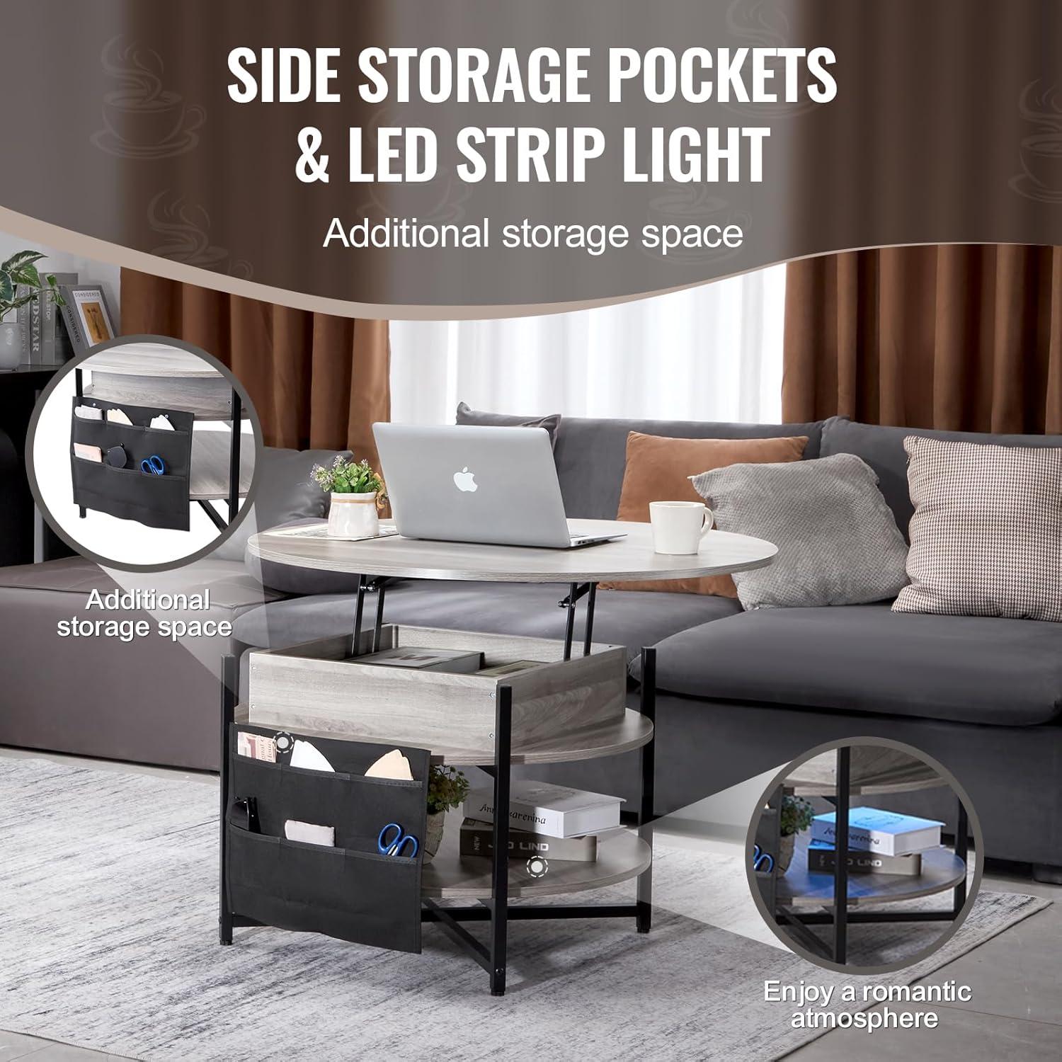 VEVOR 39.4 in Lift Top Coffee Table, Fluted Oval Coffee Table with 3 Hidden Compartment, Mid Century Wooden Oval Center Desk with Storage, Lift Up Tabletop for Home & Office, Easy Assembly, Burlywood(C-white)