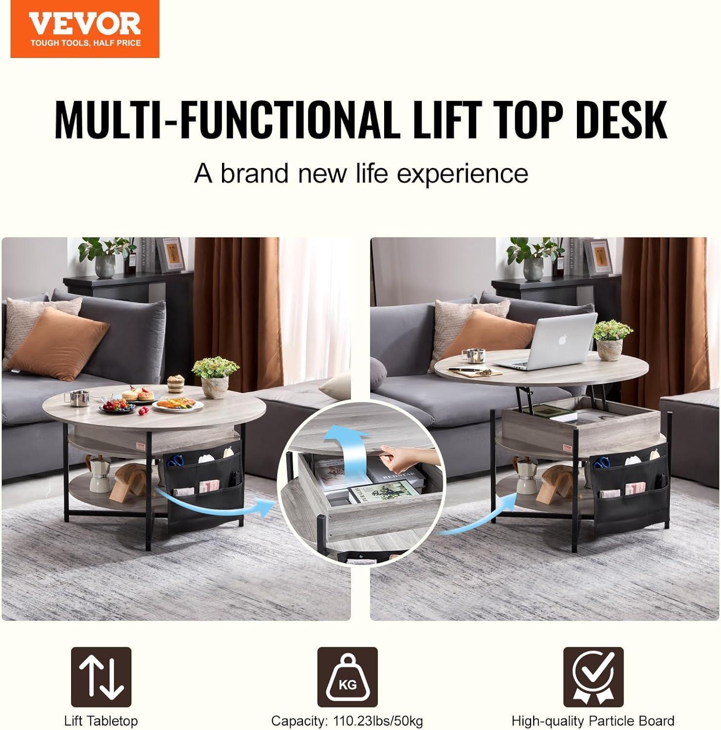 VEVOR 39.4 in Lift Top Coffee Table, Fluted Oval Coffee Table with 3 Hidden Compartment, Mid Century Wooden Oval Center Desk with Storage, Lift Up Tabletop for Home & Office, Easy Assembly, Burlywood(C-black)