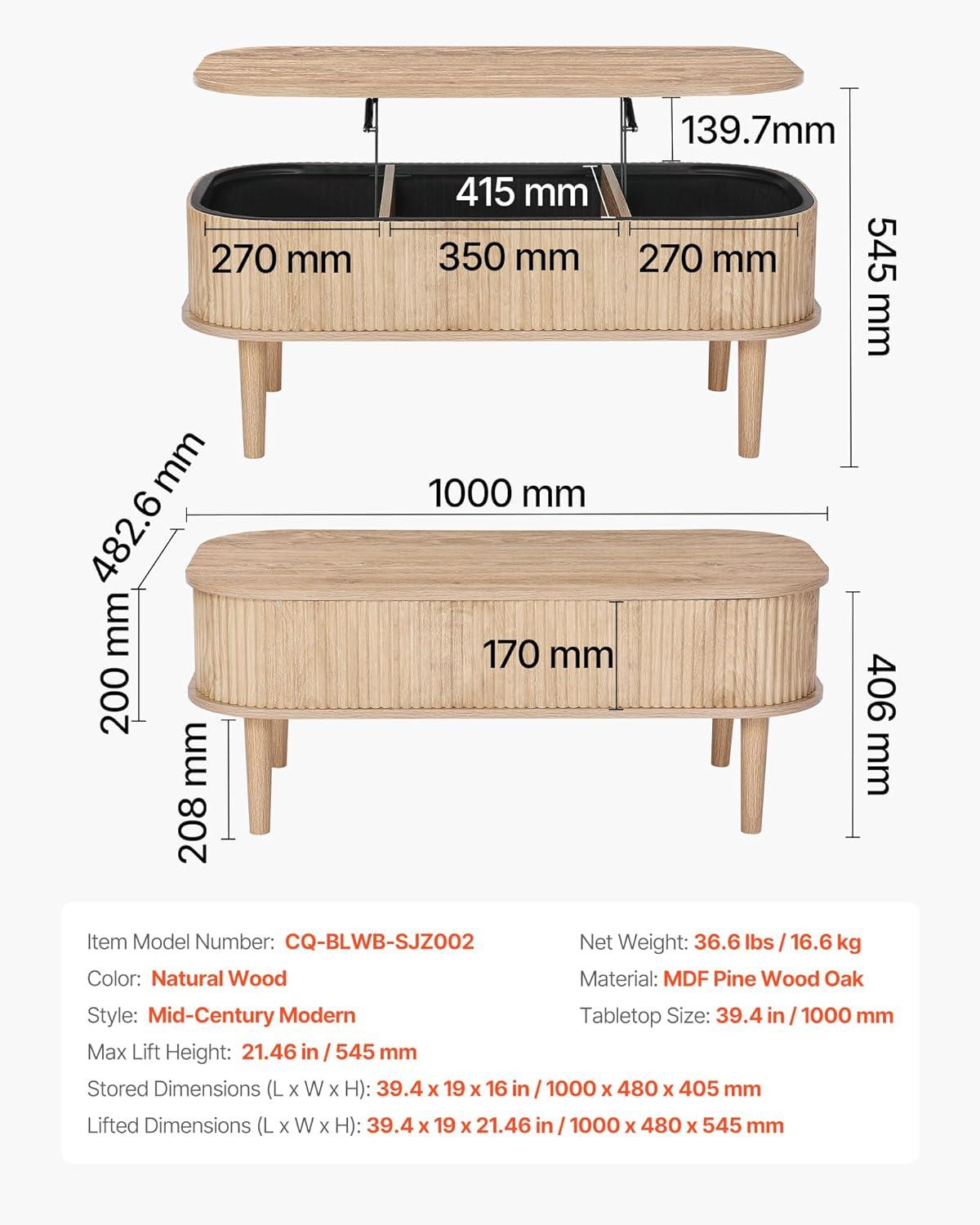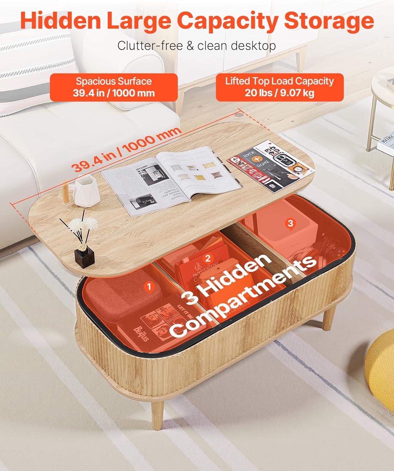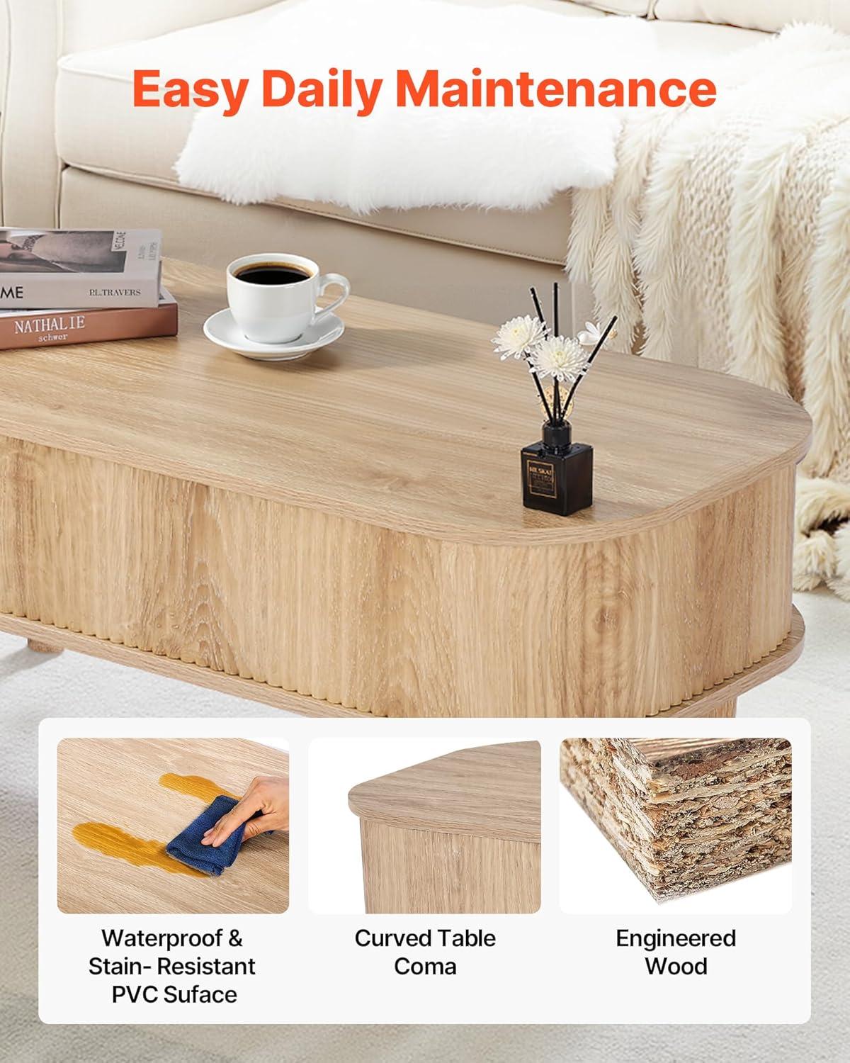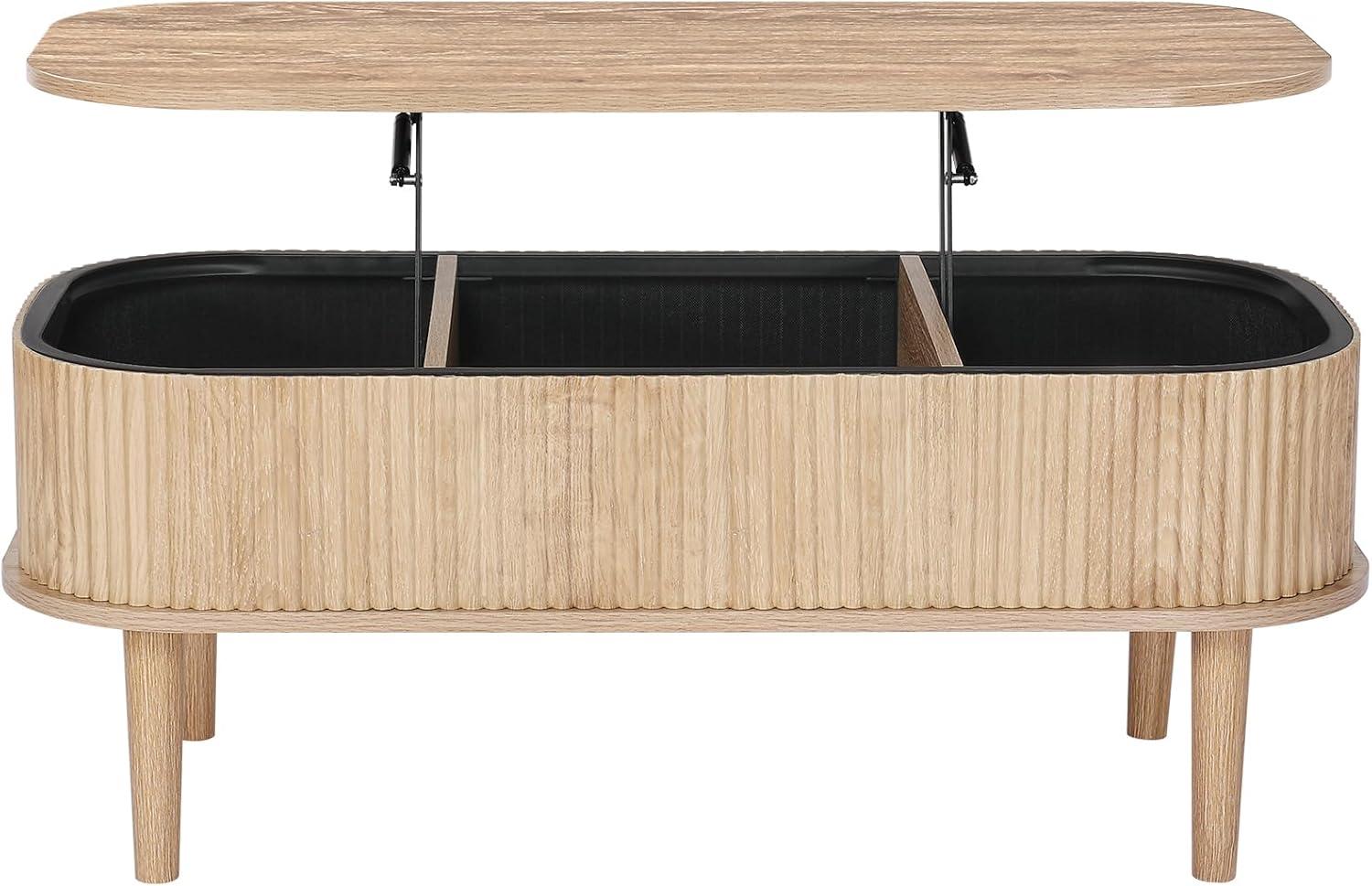 VEVOR 39.4 in Lift Top Coffee Table, Fluted Oval Coffee Table with 3 Hidden Compartment, Mid Century Wooden Oval Center Desk with Storage, Lift Up Tabletop for Home & Office, Easy Assembly, Burlywood(A-natural)