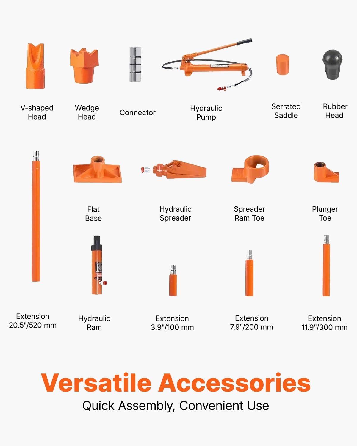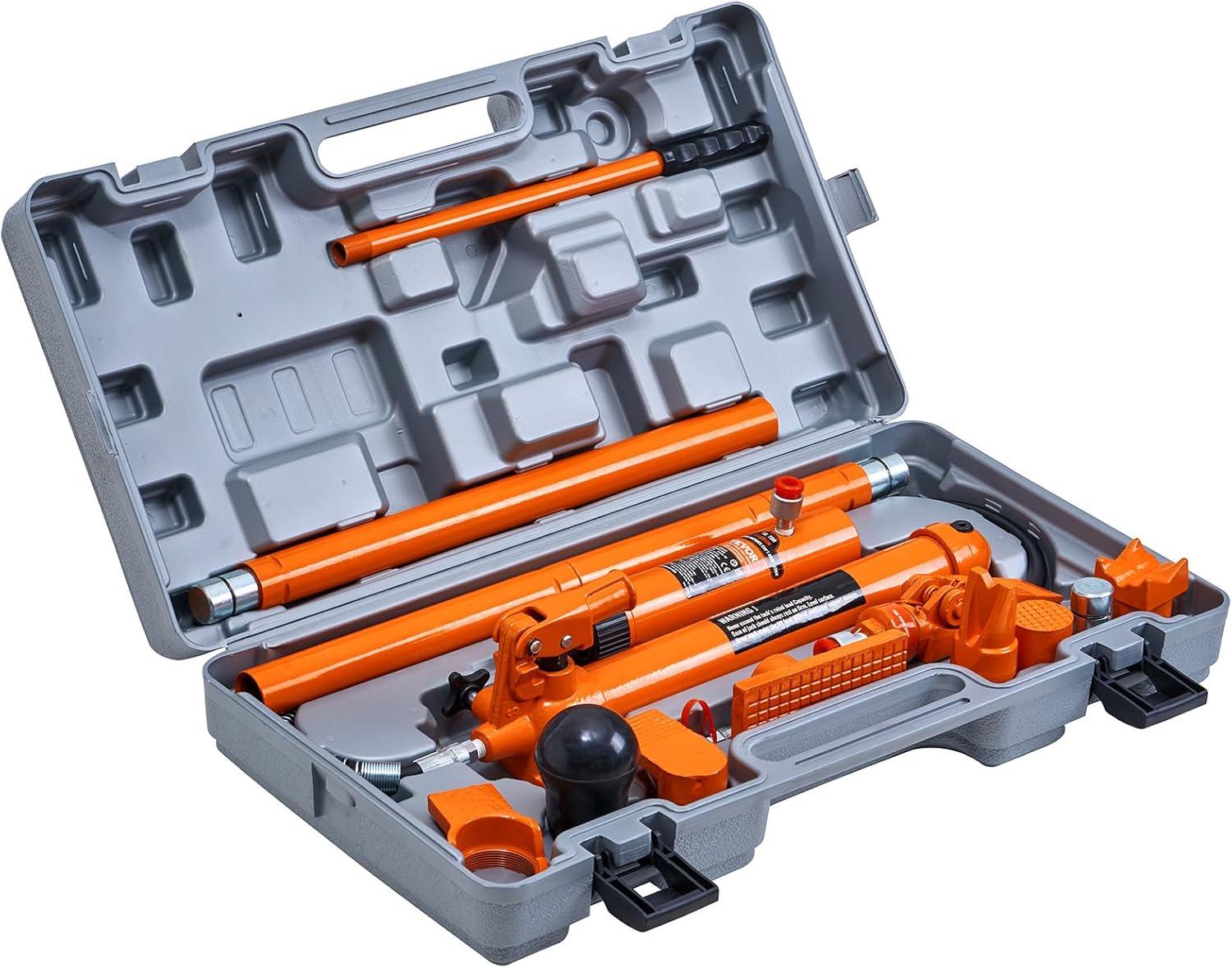 Perfect for All Your Needs: The portable hydraulic ram kit includes everything you need to complete your repair work! Hydraulic pump, hydraulic ram, 4pcs extension tubes, serrated saddle, rubber head, V-shaped head, wedge head, connector, flat base, hydraulic spreader, spreader ram toe, plunger toe. You will be ready to take on any project without breaking a sweat.