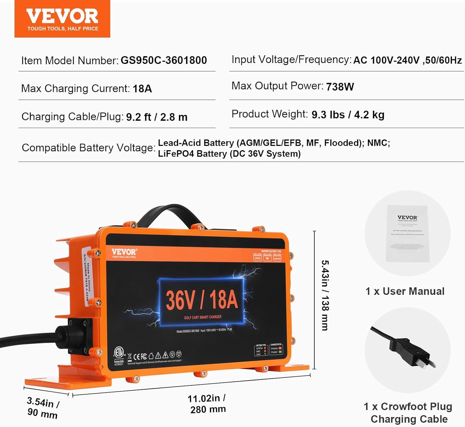 VEVOR 48 Volt Golf Cart Battery Charger, 15 AMP, Smart Battery Charger with G29 Plug, Compatible with Lead-Acid AGM/Gel/EFB MF Flooded NMC LiFePO4 Batteries for Yamaha, IP67 Waterproof ETL Certified(36V 18A For Crowfoot Plug)