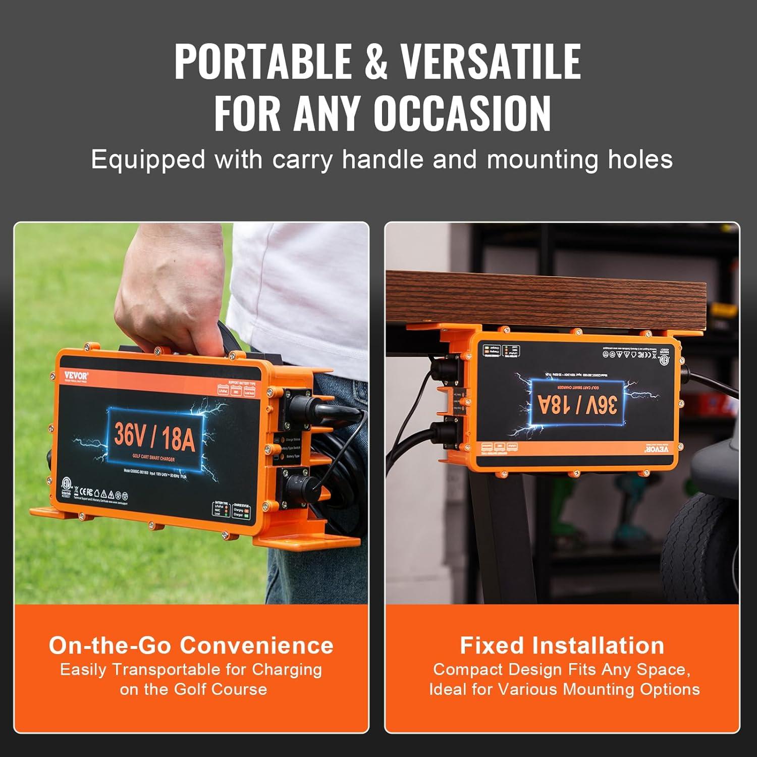 Easy Portability & Installation: Our golf cart battery charger features a convenient carry handle, making it effortless to transport across the golf course for on-the-go charging. The built-in mounting holes allow for secure installation anywhere, ensuring it stays firmly in place. The compact design of this golf cart charger saves space and fits perfectly in various environments, meeting all your storage needs.