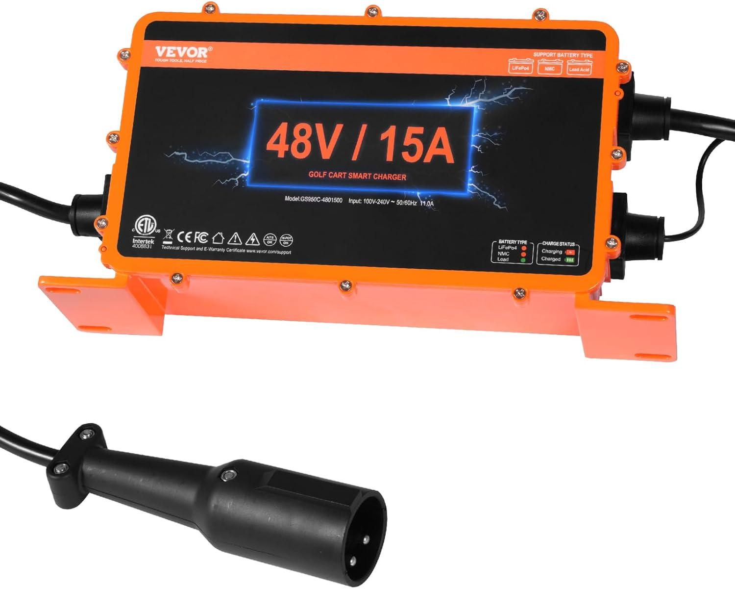 VEVOR 48 Volt Golf Cart Battery Charger, 15 AMP, Smart Battery Charger with RXV Plug, Compatible with Lead-Acid AGM/GEL/EFB MF Flooded NMC LiFePO4 Batteries for EZGO TXT, IP67 Waterproof ETL Certified(48V 15A For 3-Pin Round Plug)