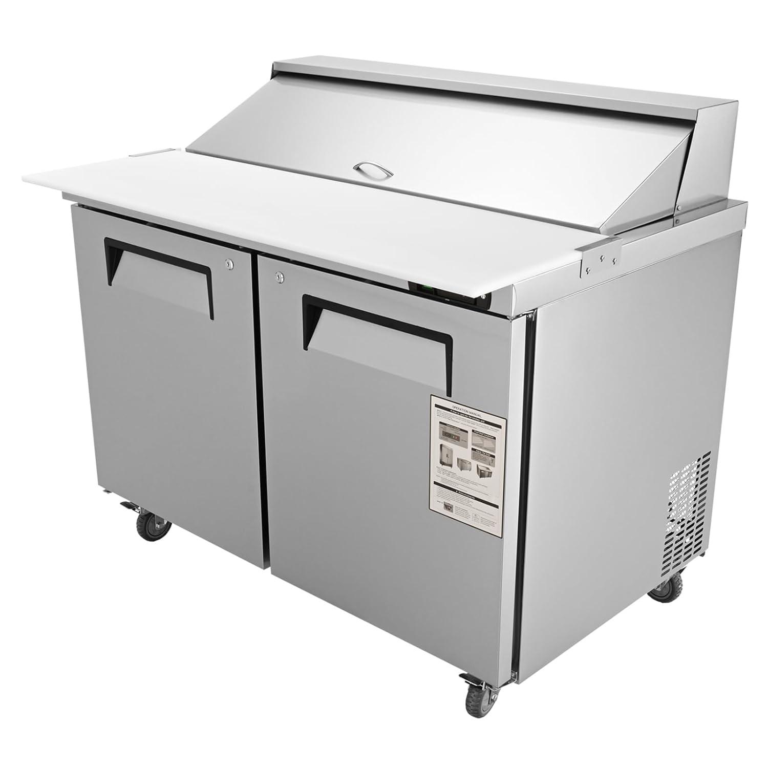 Thoughtful Design Features: VEVOR salad/sandwich prep table refrigerator comes with durable shelves designed to support heavy loads. Its innovative auto-close doors gently shut when opened less than 90°, ensuring convenience and energy efficiency. Additionally, the built-in wheels provide easy mobility, allowing you to effortlessly move and reposition the table for greater flexibility in your workspace.