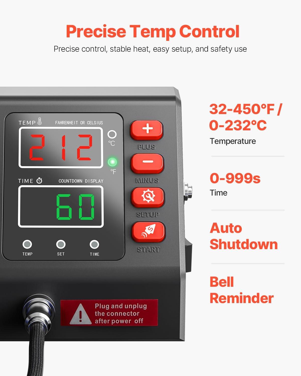 Precise Digital Control: You can preset the temperature and time according to different transfer materials to achieve satisfactory results. Temperature range: 32-480℉ / 0-250℃, time range: 0-999s. You can switch between °C and °F with the (▲/▼) buttons to select your desired temperature display mode. When the preset temperature is reached, the heat transfer machine will automatically stop and sound an alarm, preventing over-heating.