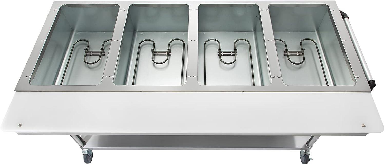 Multi-Purpose Food Warmer: Featuring a PE processing table, our 5-pot steam table provides additional workspace for convenient food preparation, cutting, and more. Furthermore, its durable bottom shelf offers ample storage for utensils, food pans, ingredients, and seasonings, keeping everything you need within reach.