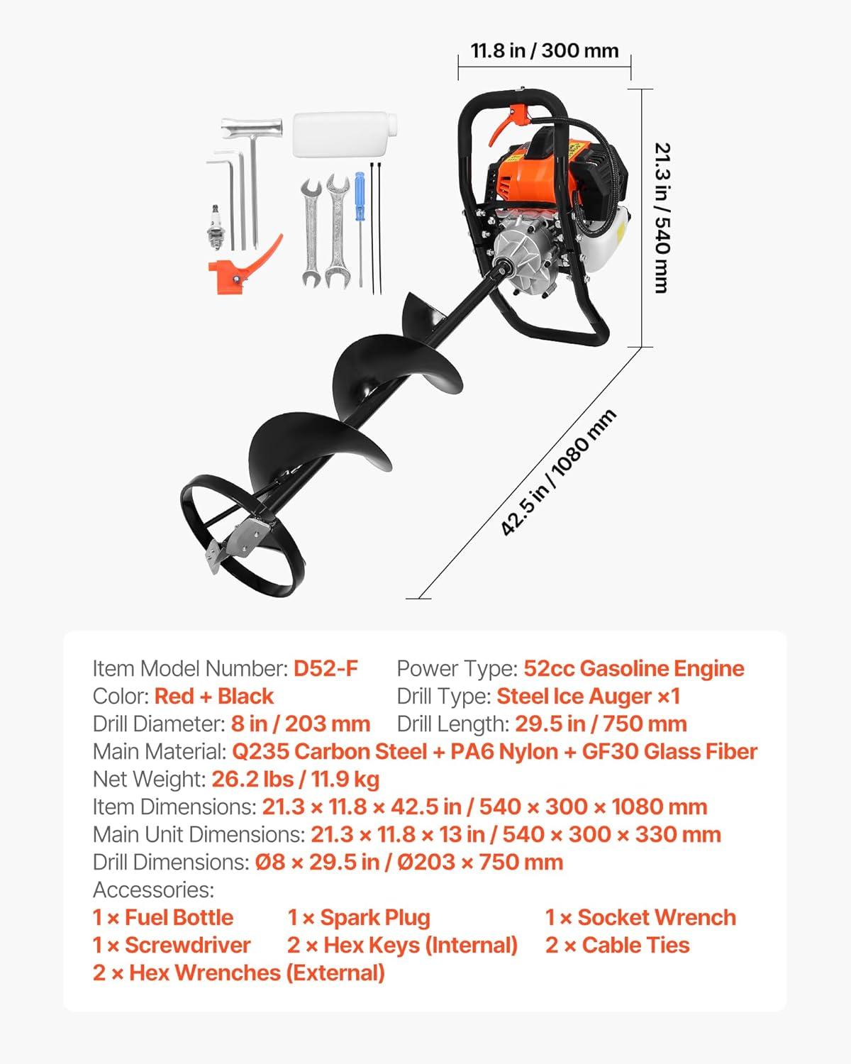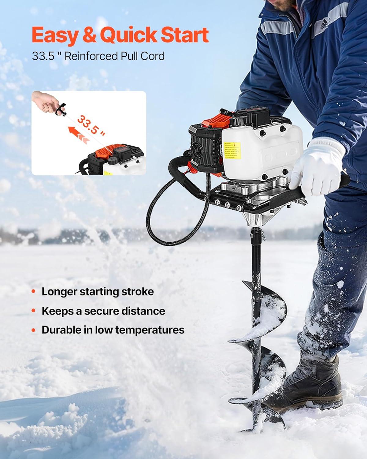 52CC GAS ICE AUGERS: This gas-powered ice auger features a 31.5″ length and 8″ diameter. Powered by a 52cc 2-stroke engine, it delivers up to 240 RPM drilling speed and a 9500 RPM maximum motor speed. With robust power, it easily cuts through thick ice in seconds. Ideal for ice fishing and ice exploration
