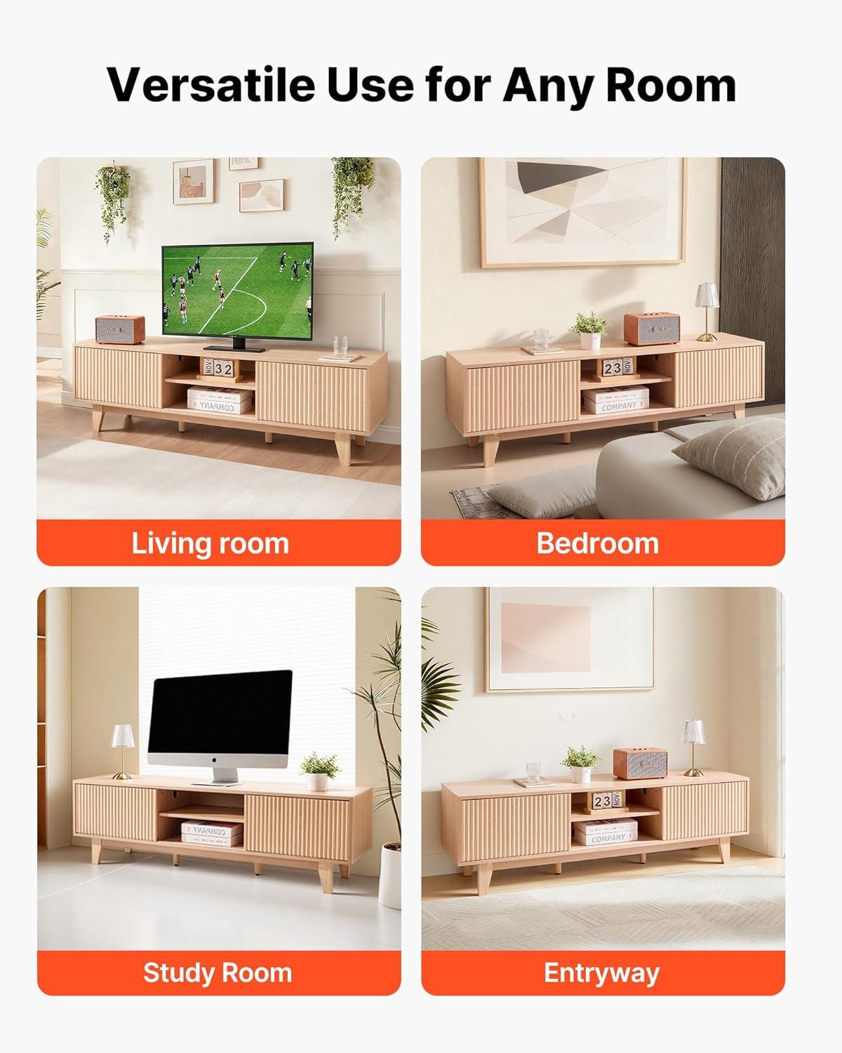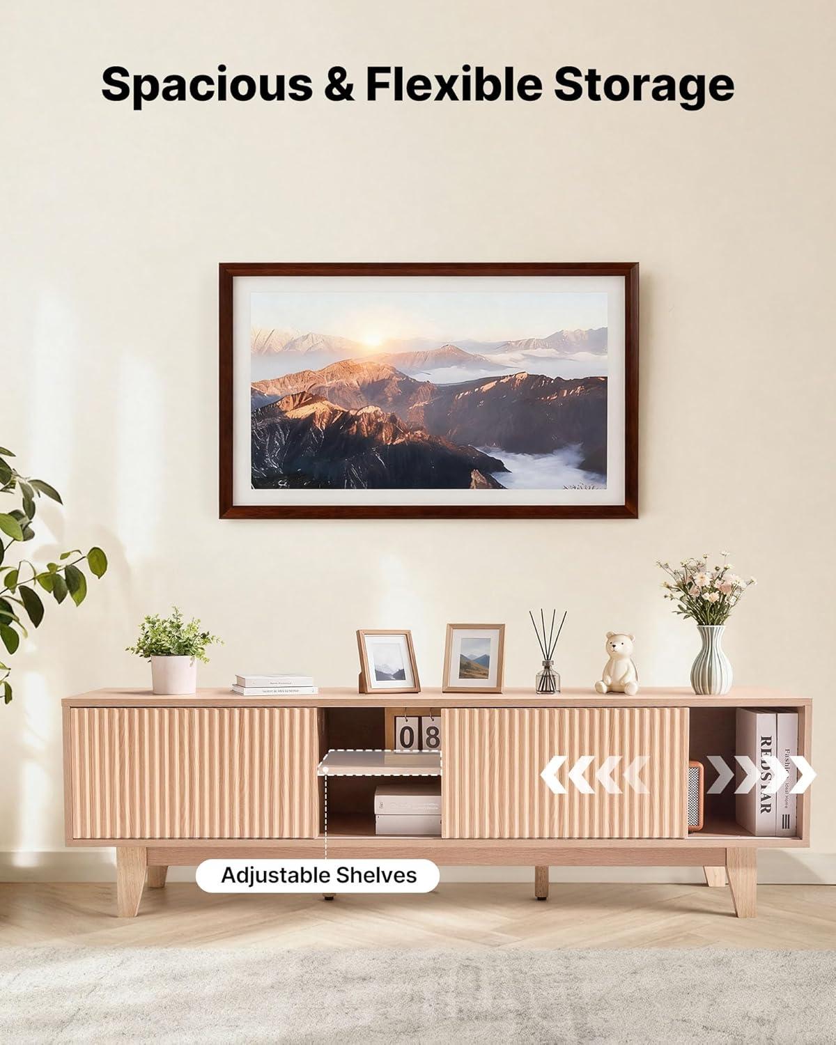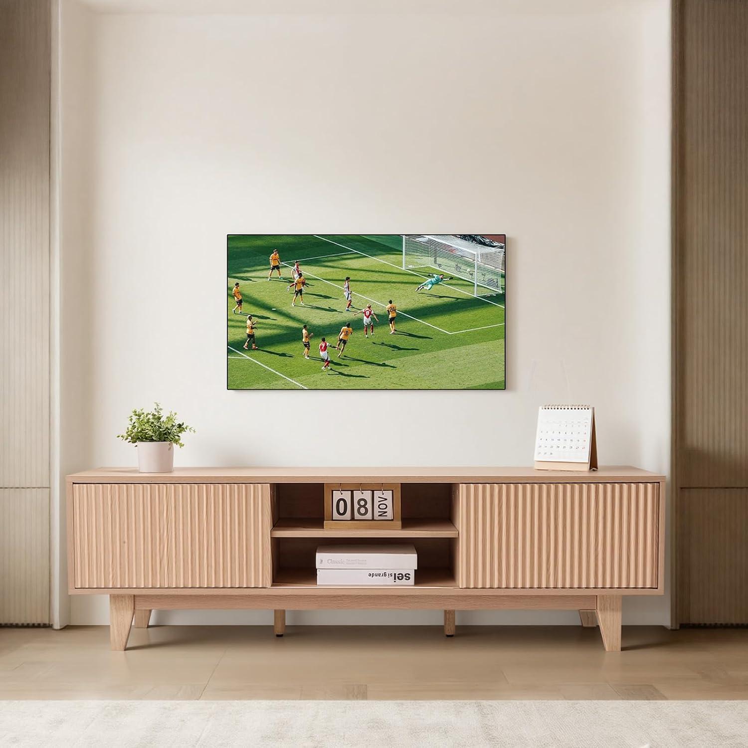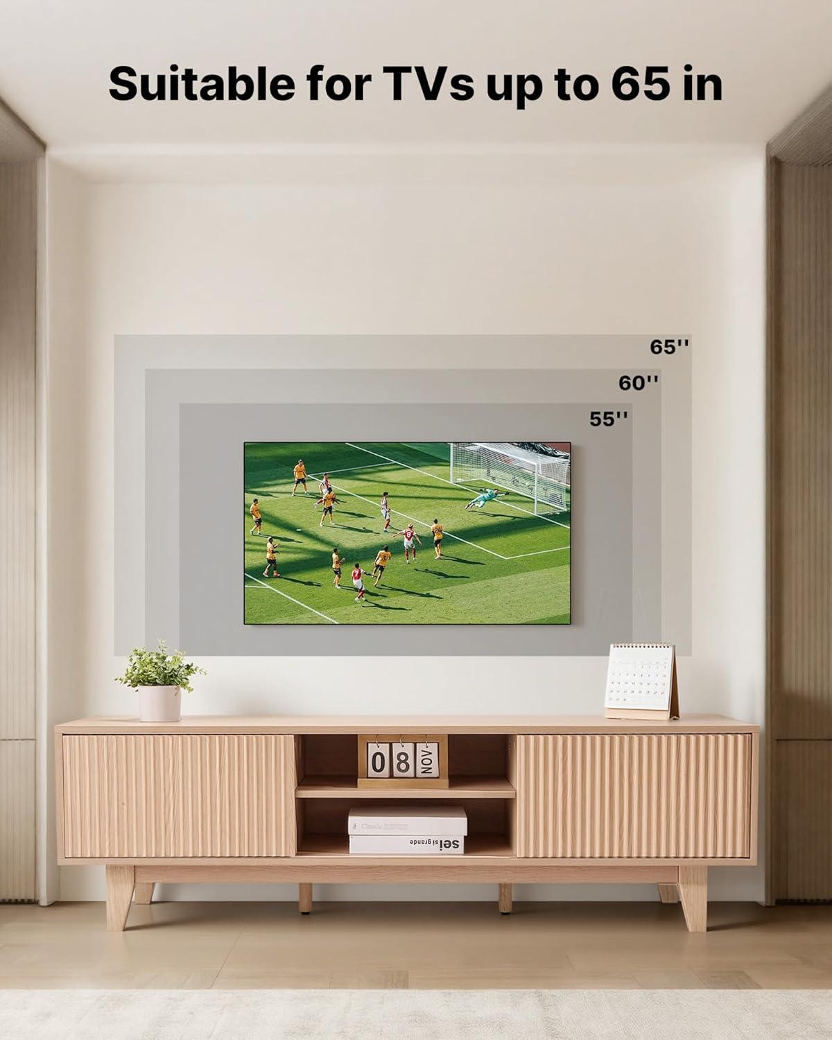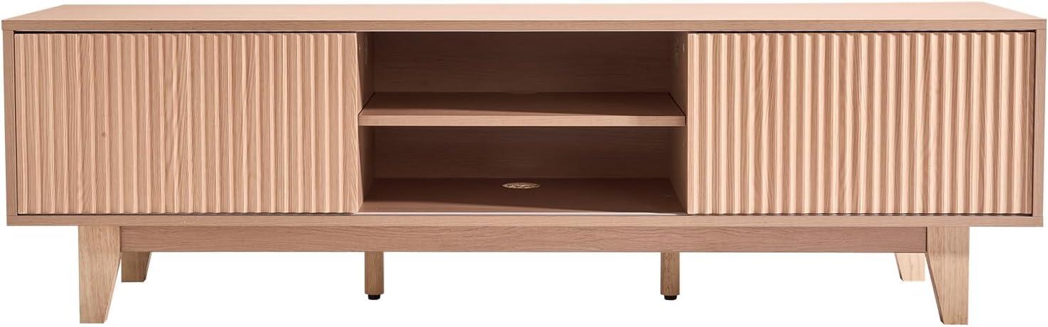 Fits Up to 65 in TVs: This bohemian-style TV stand is designed for 55–65 in TVs. Featuring natural wood color with a grooved door frame design, it is suitable for living rooms, bedrooms, and home offices, making your space fashionable