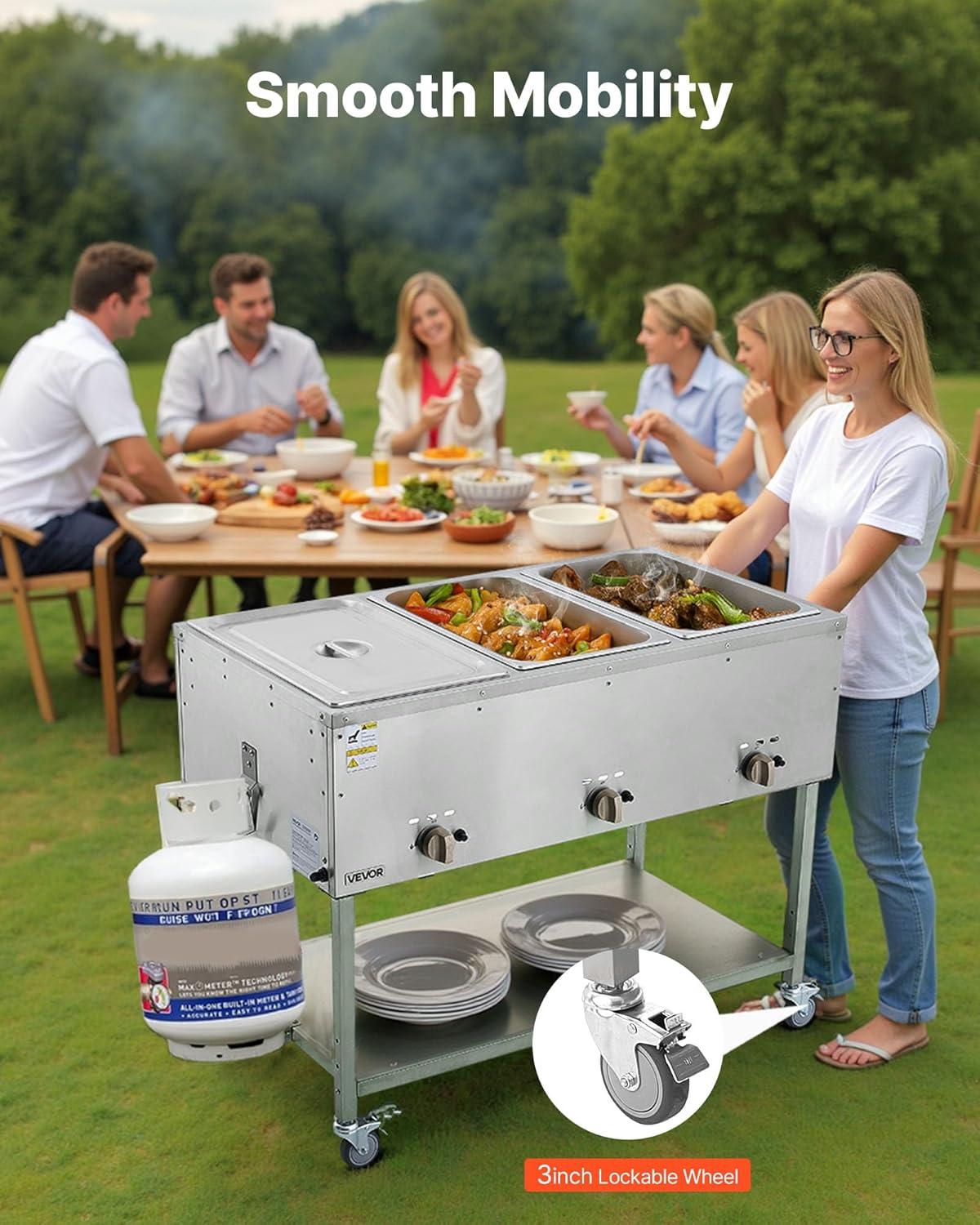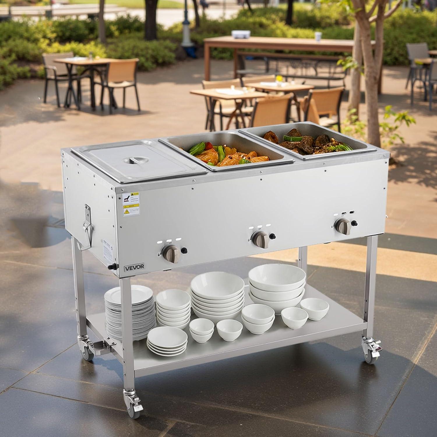 VEVOR 6-Pan Commercial Propane Steam Table, LP Gas Outdoor Soup Warmer with Drain Valve and 3" Wheels, Stainless Steel Propane Food Warmer with Adjustable Temperature, for Restaurant Outdoor Camping(3×1/1 Pan;72QT)