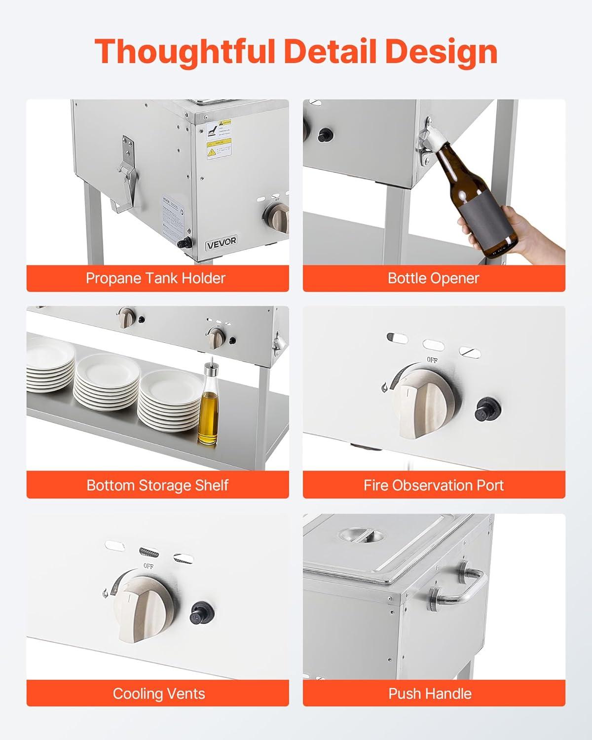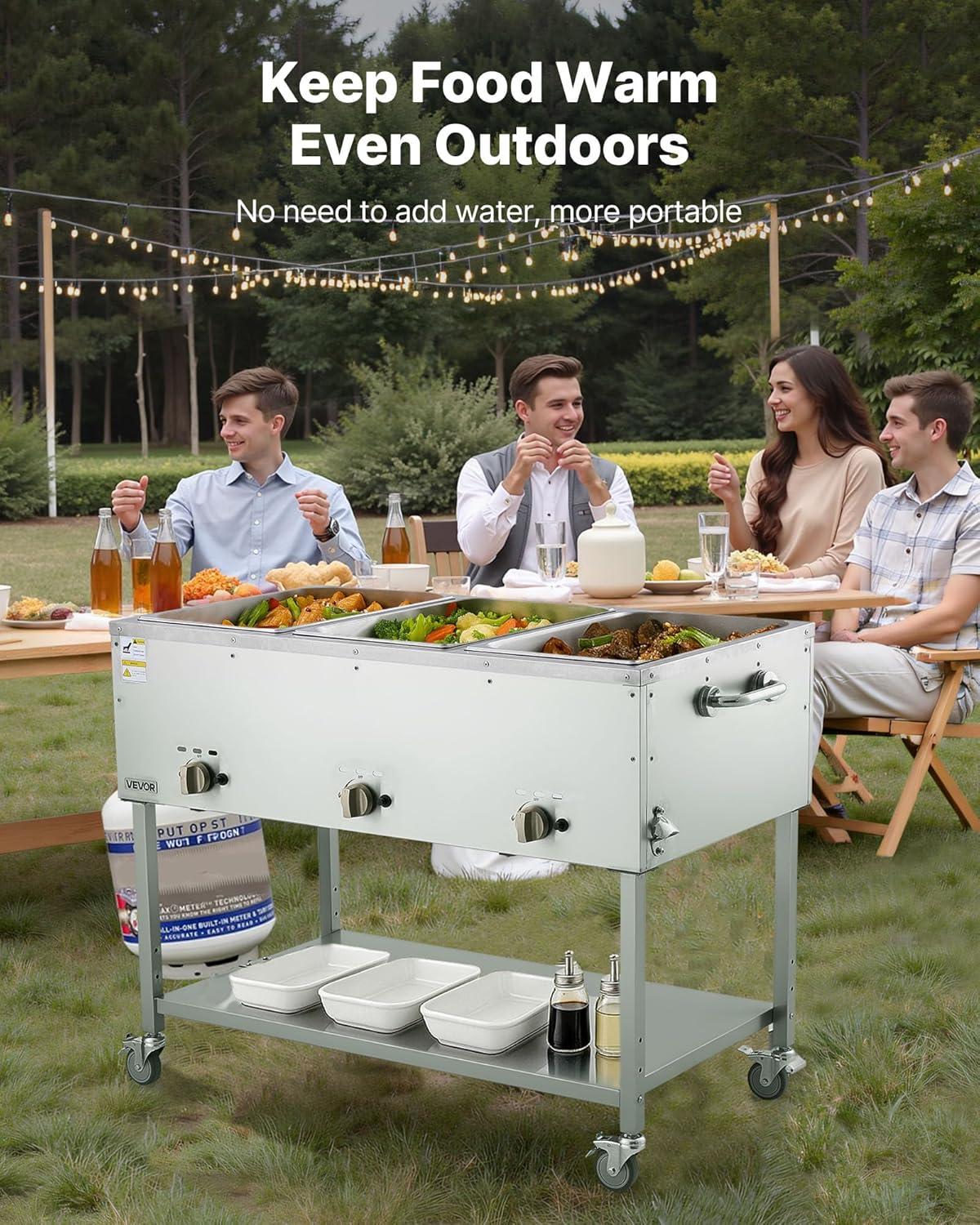 VEVOR 6-Pan Commercial Propane Steam Table, LP Gas Outdoor Soup Warmer with Drain Valve and 3″ Wheels, Stainless Steel Propane Food Warmer with Adjustable Temperature, for Restaurant Outdoor Camping(4×1/1 Pan;96QT)