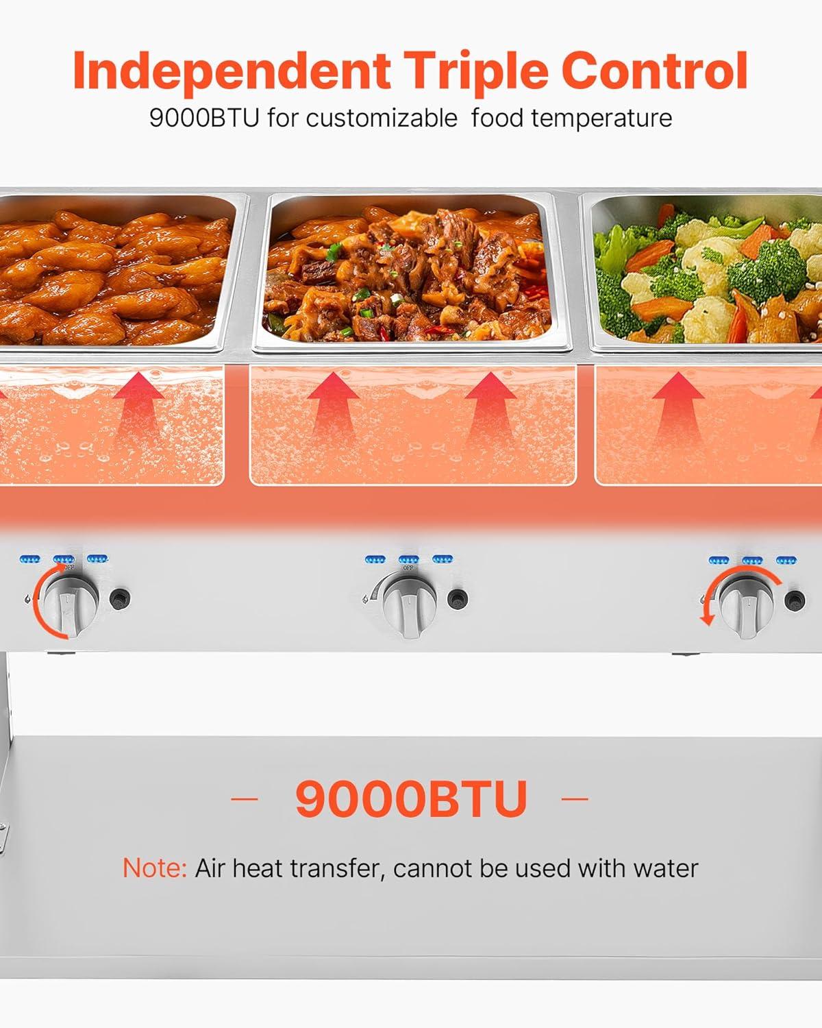 VEVOR 6-Pan Commercial Propane Steam Table, LP Gas Outdoor Soup Warmer with Drain Valve and 3″ Wheels, Stainless Steel Propane Food Warmer with Adjustable Temperature, for Restaurant Outdoor Camping(3×1/1 Pan;72QT)