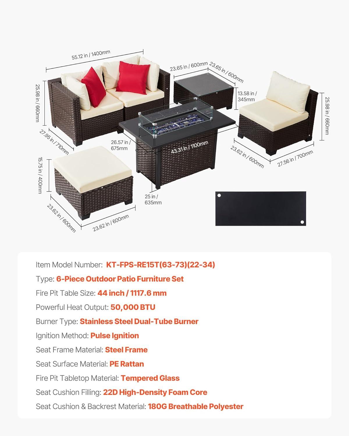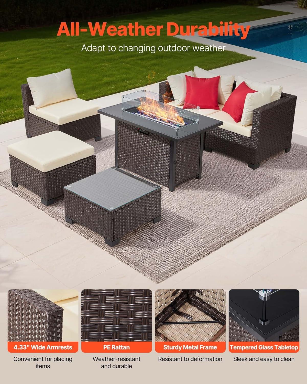 Sleek and Comfortable: VEVOR 6-piece patio furniture set includes 44-inch fire pit table, 1 coffee table, 1 ottoman, 2 corner sofas, and 1 armless sofa. Supporting flexible combinations, it’s ideal for patios, gardens, or poolside, creating a cozy gathering space for family and friends