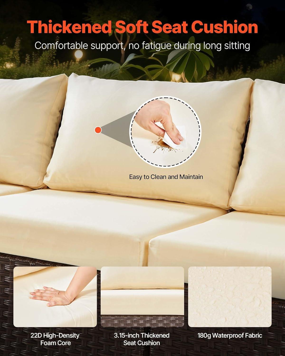 Superior Comfort: Equipped with a 3.15-inch thick cushion and 22D high-density foam, the patio furniture set offers soft support without pressure. The 180g waterproof fabric resists dirt and splashes, easy to clean with a wipe, bringing you a relaxing outdoor leisure experience