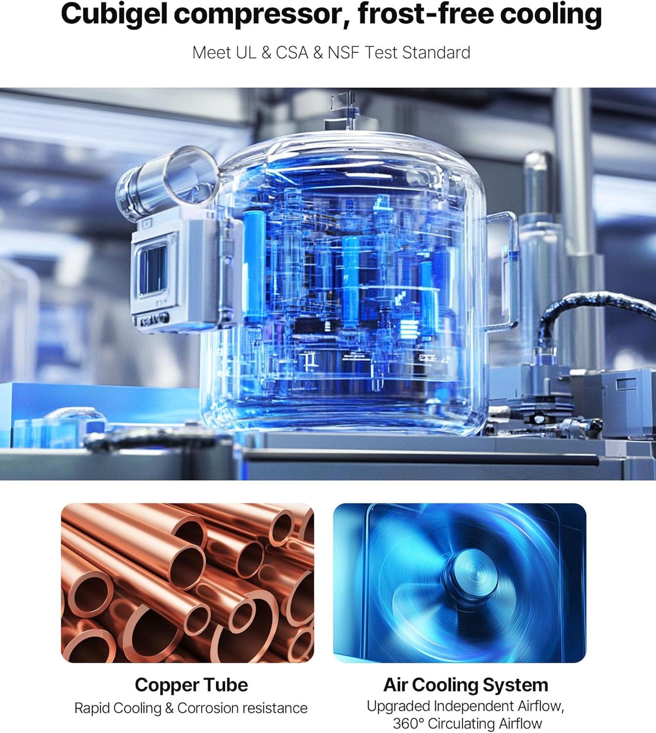 Rapid Cooling: The unit features a branded compressor and finned copper tubing for consistent and even cooling, ensuring long-lasting freshness for your ingredients. The cabinet door is insulated with a foam layer and closes automatically within a 75° angle without needing to be pushed, enhancing food preservation and energy efficiency.