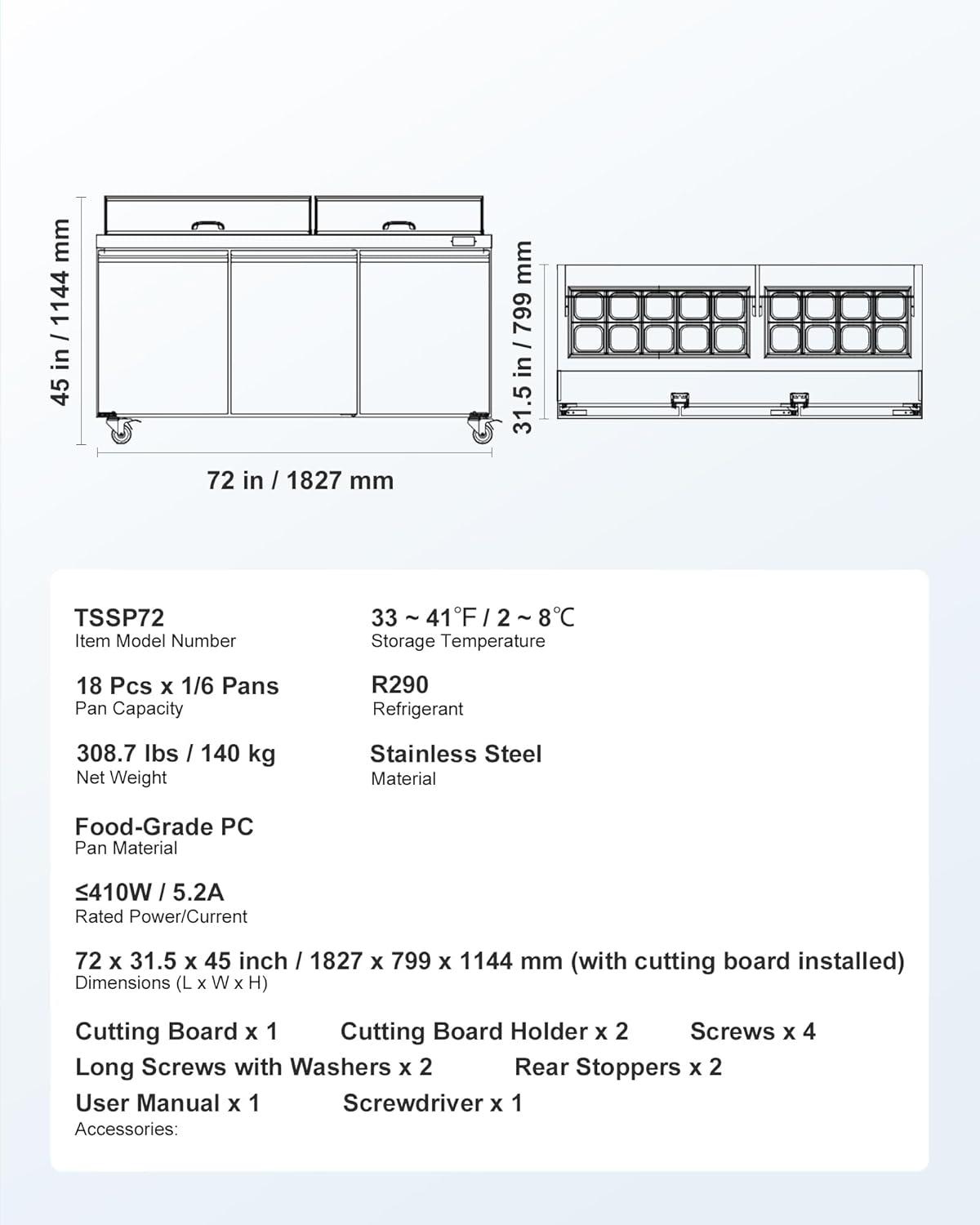 Spacious Work Surface: Comes with a thick cutting board that offers generous room for preparing salads, sandwiches, and pizzas. Includes 16 removable 1/6 pans made from food-grade PC material, designed for easy cleaning and organized ingredient storage